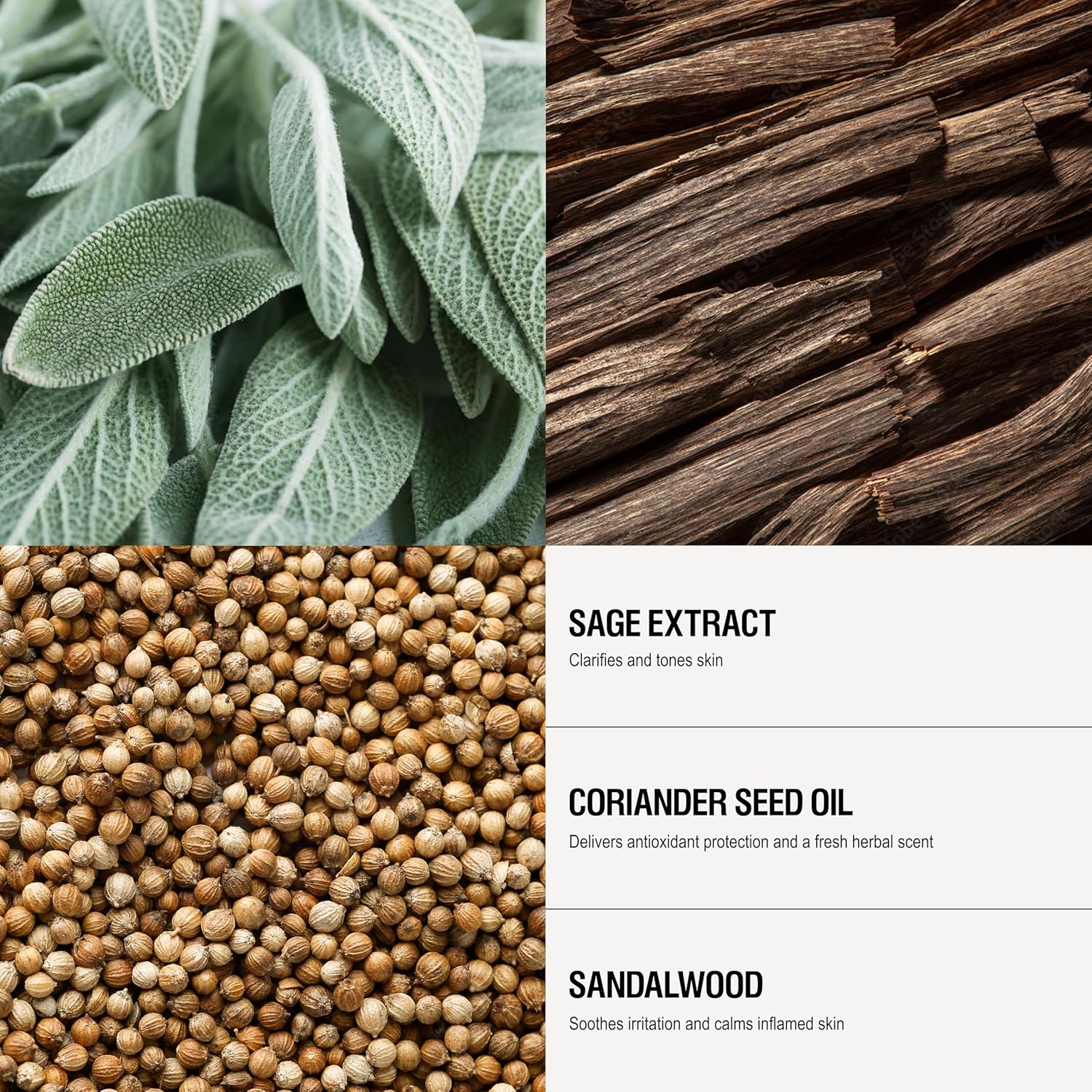 - Shave Gel for a close, smooth shave with hydrating botanicals; sandalwood & sage. Bioactive tri-peptides noticeably protect skin cells from free radical damage while Sandalwood & Coriander Seed Oil actives calm & soothe the skin