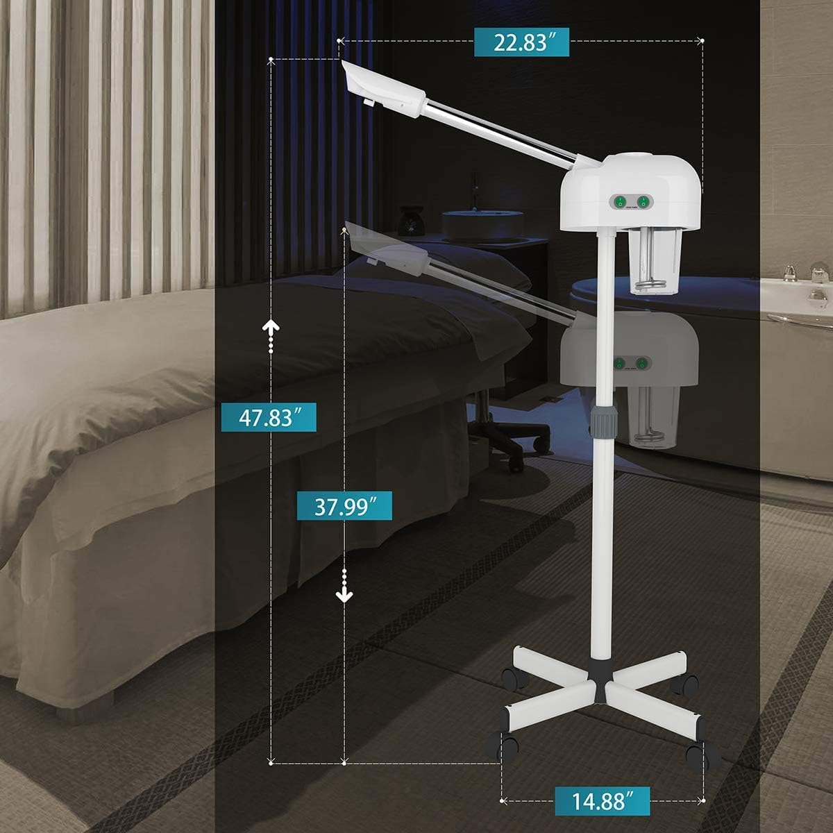 - ā EXQUISITE WORKMANSHIP : Titanium atomizing disc, more foggy, more fine, can extend spraying time. High quality SS pipe, sturdy and durable, no rust. Thicker high capacity water cup, can store 600ml water. The head of the machine is free to rotate 360°. Adjustable height from 38.1" - 46.4". Easy moving with universal wheels.