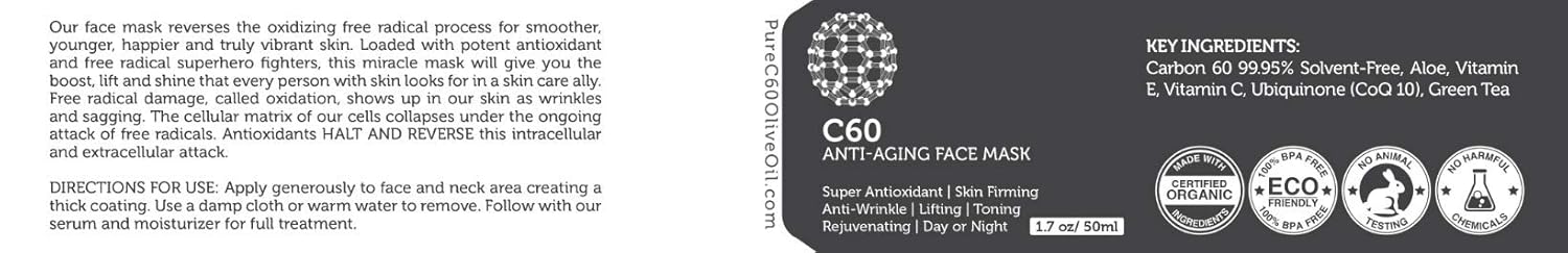 C60 Anti-Aging Face Mask 50ml with Green Tea, Aloe, Ubiquinone (CoQ 10), Vitamin E and Vitamin C for Men & Women Made with Organic Ingredients - From The Leading Global Producer