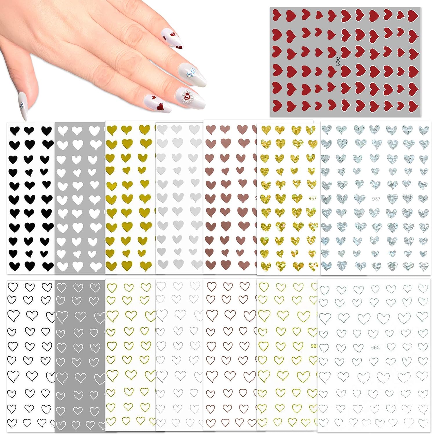- There are two kinds of heart designs - solid heart shape and hallow out heart shape. Each design has 7 different colors - black, white, gold, silver, rose gold, laser gold and laser silver. Besides, there is also a sheet of red heart nail stickers.