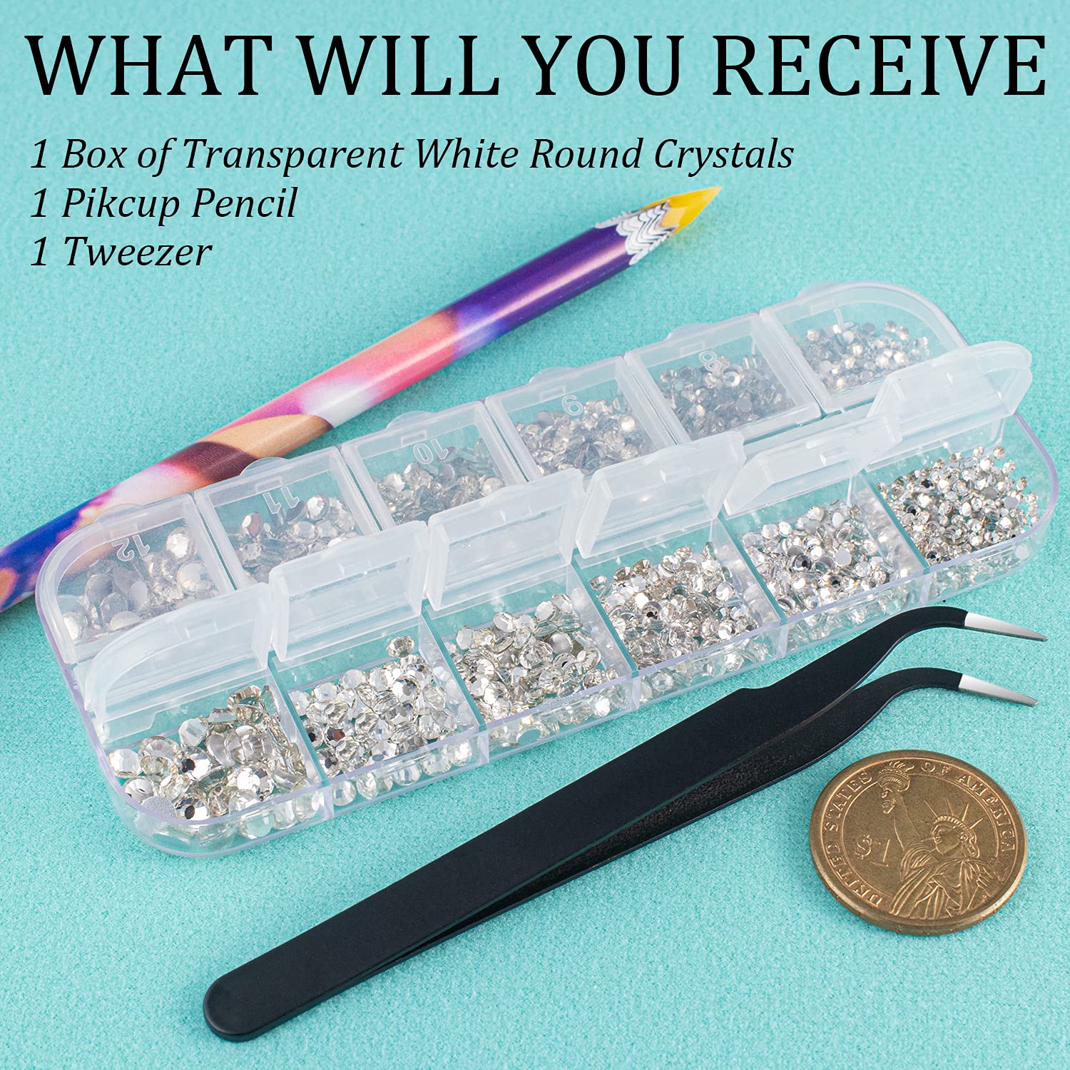 • ❤WHAT YOU WILL RECEIVE -- 1 Box of 6 Sizes Transparent White Round Glass Nail Crystal Rhinestones Beads (Totally About 1720 PCS); 1 PCS Rhinestone Picker Pencil; 1 PCS Tweezer. The Well Equipped Rhinestone Set Is Suitable for Both Professional Nail Technician and Inexperienced Starter for Nail Art.