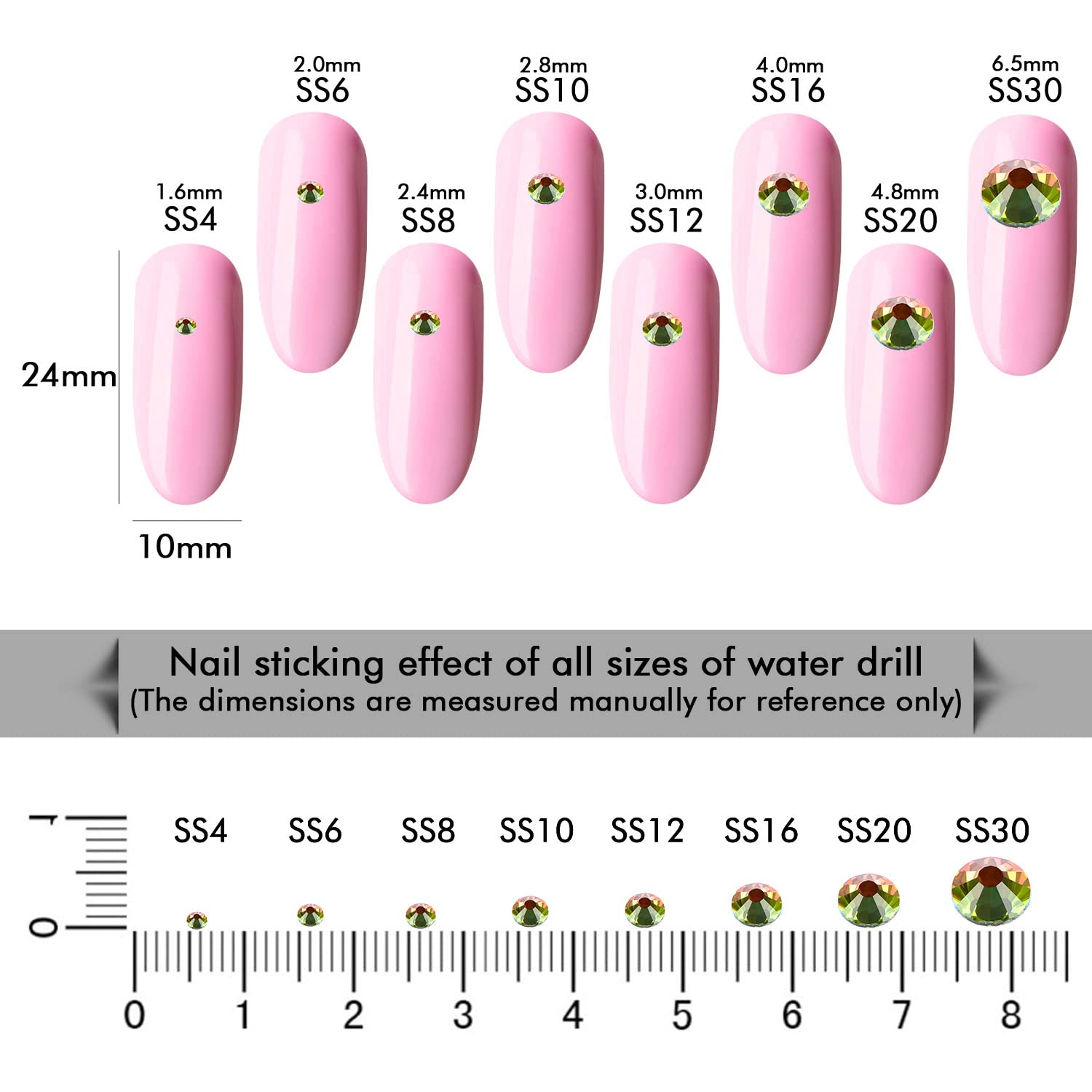 - Different Sizes Available:These rhinestones for crafts come in a wide range of sizes (1.6mm, 2mm, 2.4mm, 2.8mm, 3mm, 4mm, 4.8mm) to suit your different needs