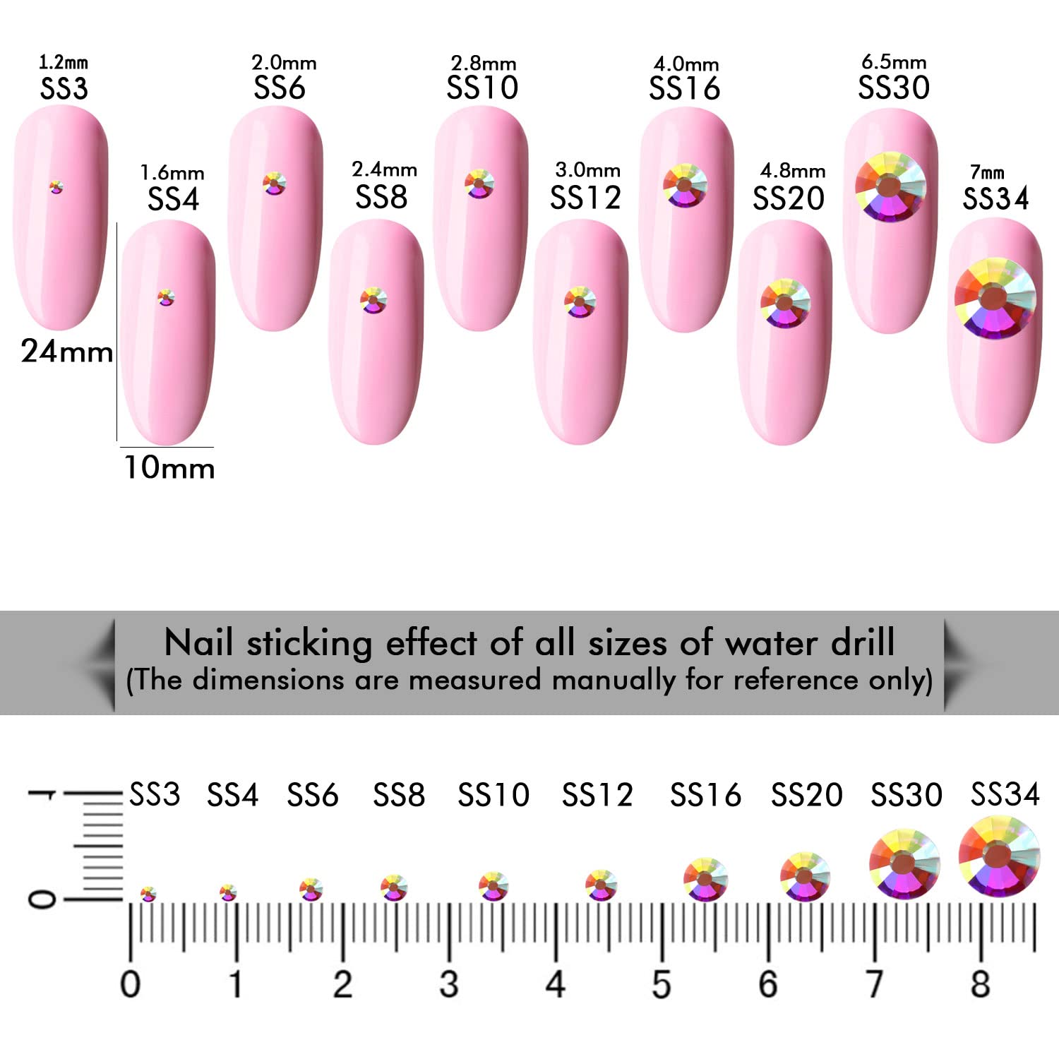 - Different Sizes Available:These rhinestones for crafts come in a wide range of sizes (1.6mm, 2mm, 2.4mm, 2.8mm, 3mm, 4mm, 4.8mm) to suit your different needs