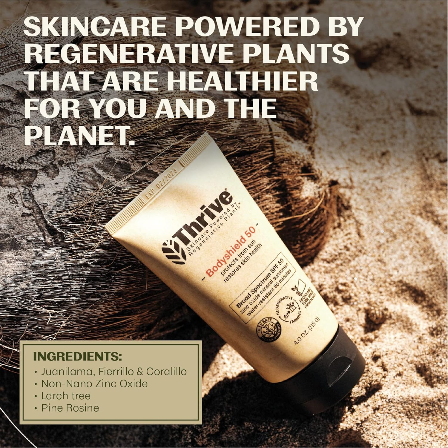- NATURAL SPF PROTECTION - SPF 50 Sunscreen powered by Thriveโs antioxidant rich Costa Rican super-plants, Juanilama, Fierrillo & Coralillo, delivered in a tube made from recycled plastic, for a lighter environmental footprint. Our regenerative plant-derived formula helps reduce irritation and redness while repairing skin from sun exposure.