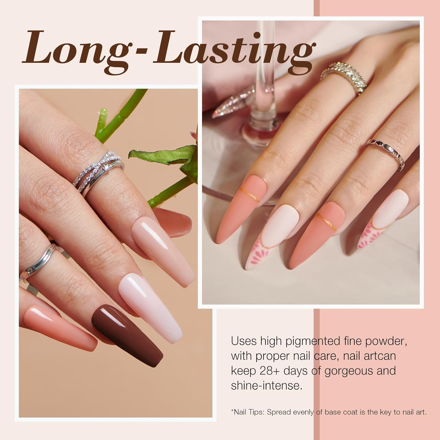 - 【Superior Quality & Long Lasting】 AZUREBEAUTY dipping powder nail kit is long-lasting and anti-chipping, anti-peel off. The color is full and natural-looking, light, and has an impeccable shine finish. It can keep the nail art gorgeous and shiny for more than about 28 days with proper application. (REMINDER: The effection of dip powder may show differently in different people, 2~3 base coats while using will be the best.)