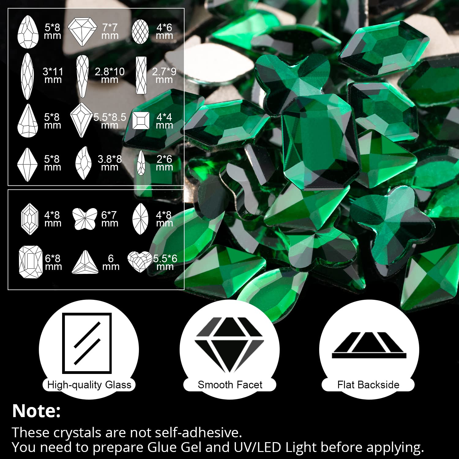 - WHAT YOU WILL RECEIVE -- The package includes 1 box of 12 styles of multi-shaped Dark Green gems, 1 box of mixed round and 6-style multi-shaped Dark Green stones, 1 pickup pencil and 1 tweezer.
