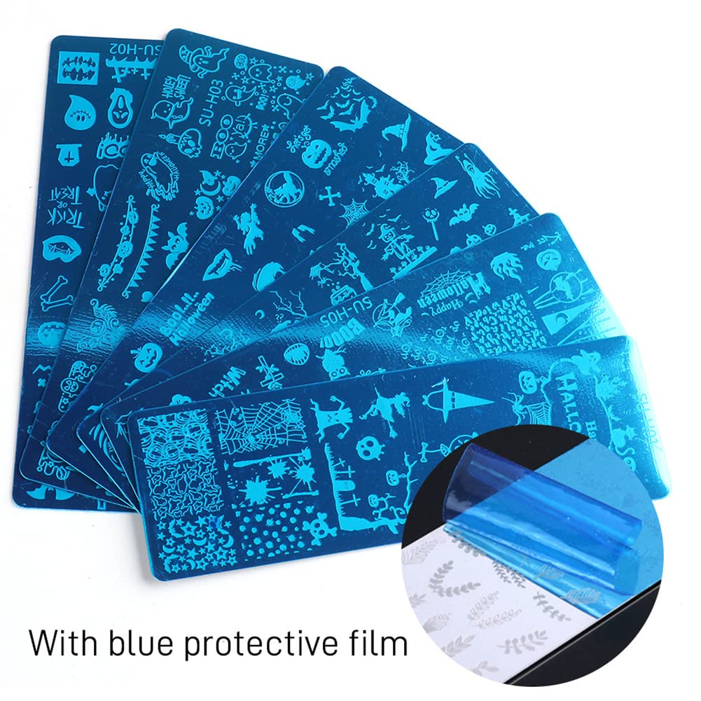 - [Package]:๐Our Halloween nail art stamping set includes 6pcs nail stamping plates, 1 Stamper, 1 Lace scraper, and the size of each stamping plate is 4.72*1.57 inch.