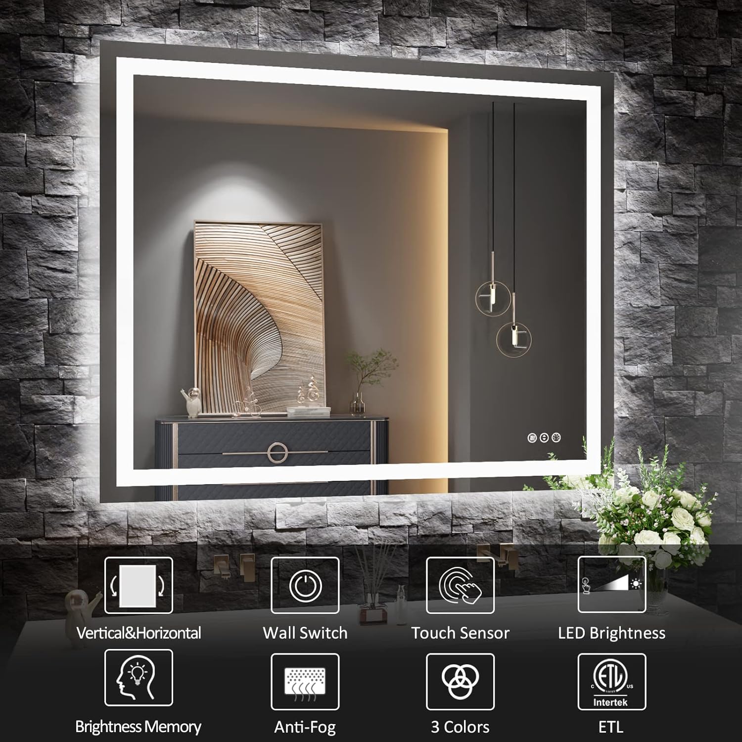 Amorho LED Bathroom Mirror 48''X40'' with Front and Backlit, Stepless Dimmable Wall Mirrors with Anti-Fog, Shatter-Proof, Memory, 3 Colors, Double LED Vanity Mirror, ETL Listed