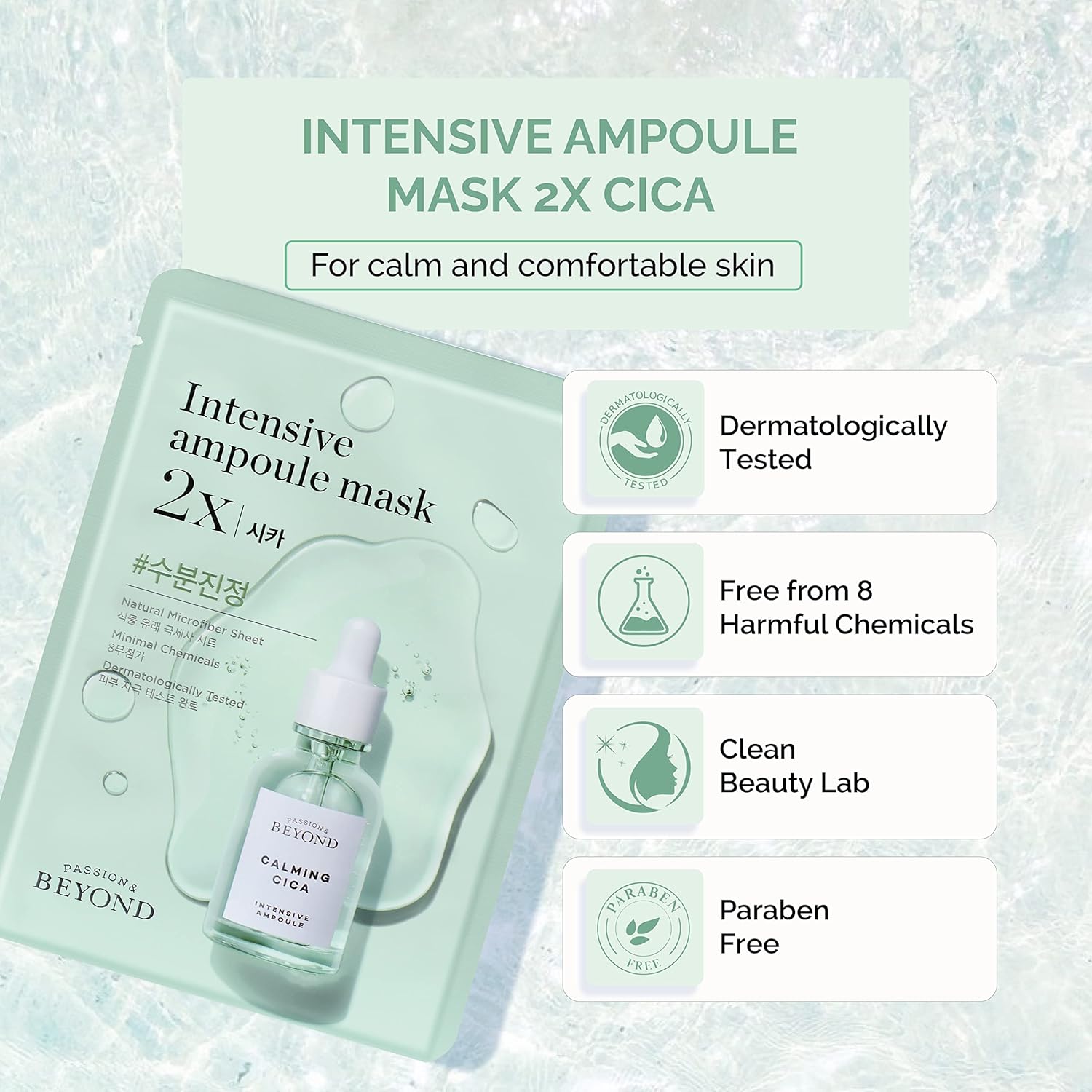 - DIFFERENTIATED FORMULA - BEYOND's Ampoule Mask 2X line provides targeted solutions for various skin concerns through differentiated formulae. "Ampoule Mask 2X Cica" comes in a clear, highly-concentrated formula developed to help soothe/calm and moisturize irritated skin without leaving a sticky residue.