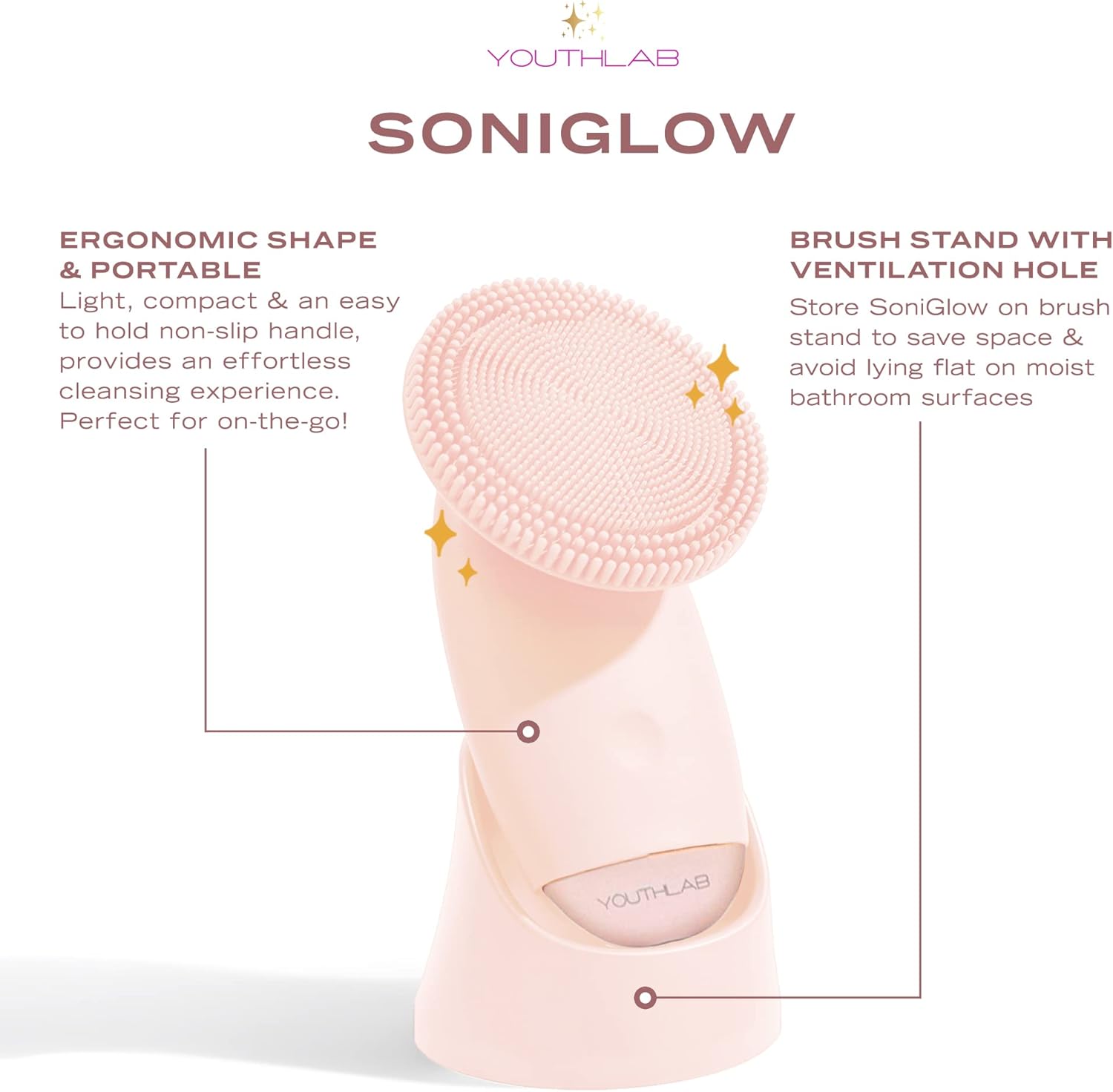 - BRUSH STAND WITH VENTILATION HOLE: Store SoniGlow on brush stand to save space & avoid having it lie flat on moist bathroom surfaces.