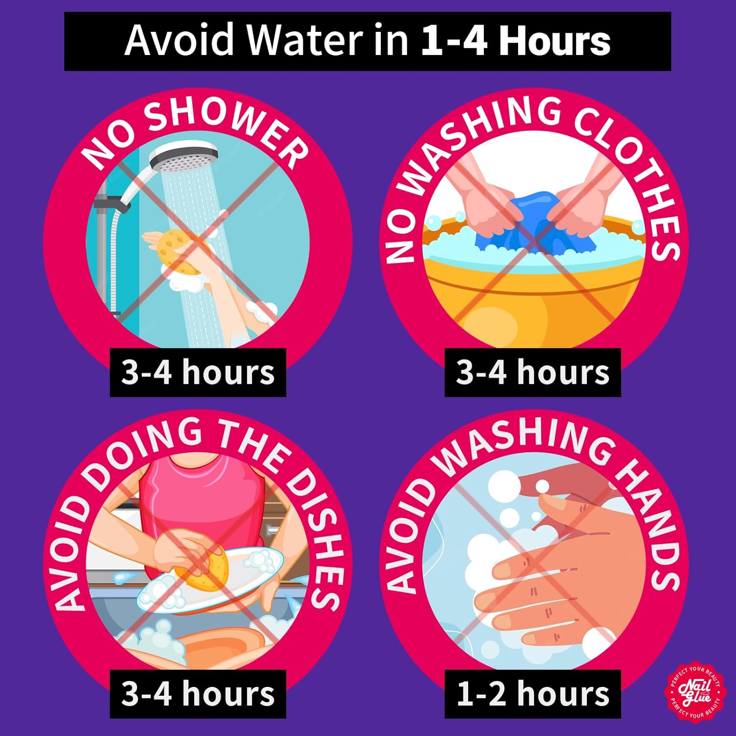 - Tips for Better Stickiness & Longer Lasting: Please avoid touching water in 1-4 hours, especially take a shower, wash clothes or do the dishes, avoid washing your hands in 3 hours after applying nail glue; you can use nail file to file your nail bed to make it rough then apply nail glue will get better stickiness