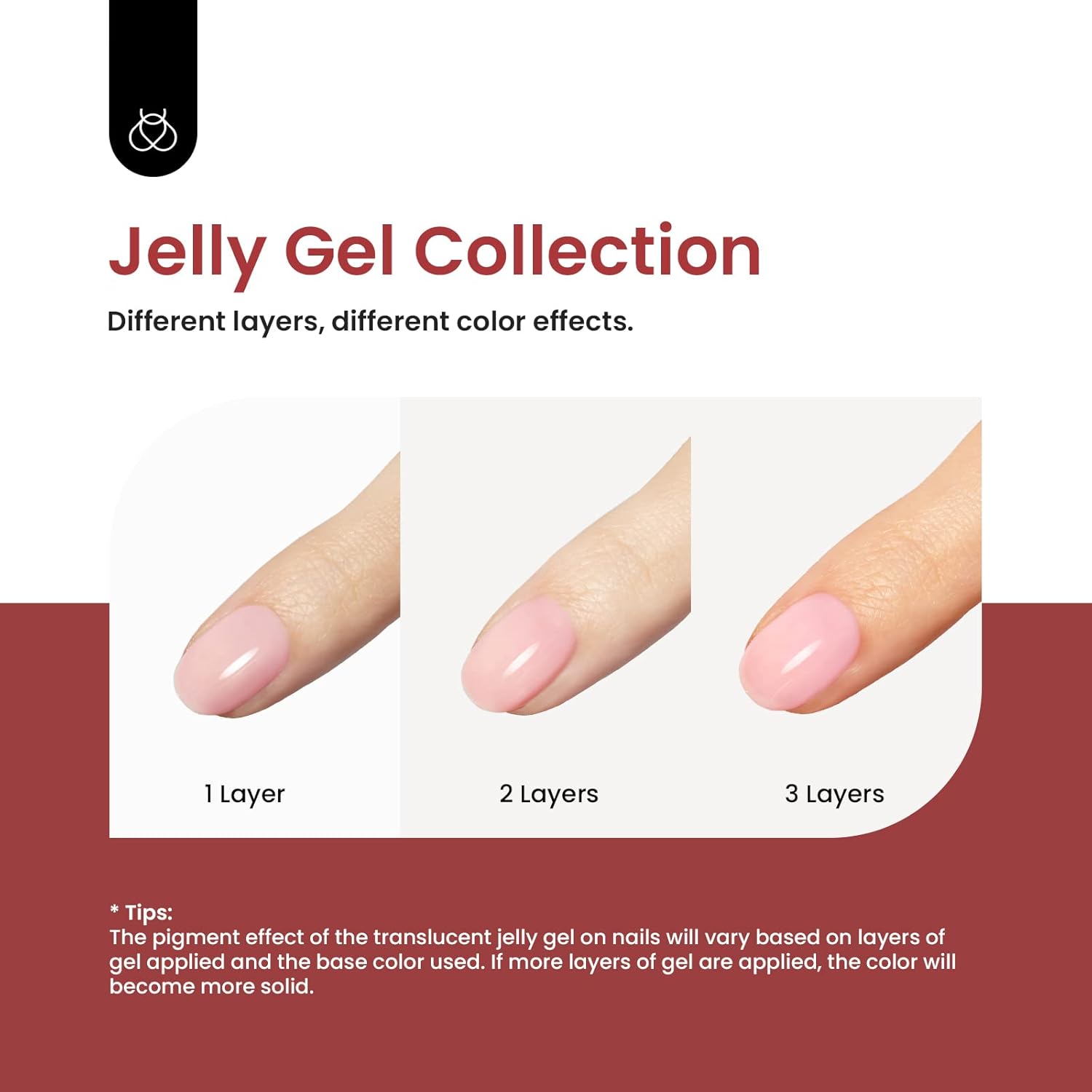 - [Sheer Gel Polish]: Apply several layers to build up the color from clear translucent to solid opaque. One layer, two layers and three layers are different effect.