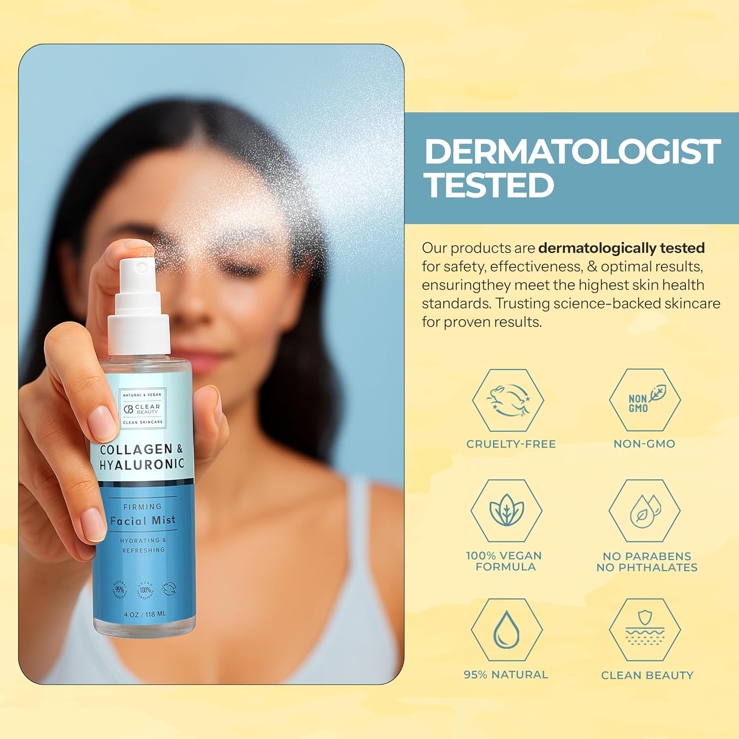 Hyaluronic Acid & Collagen Face Mist - Dermatologist Tested, Moisturizes & Tones Skin, Anti-Aging, Natural Ingredients, Cruelty-Free, 95% Natural - All Skin Types - 4 OZ