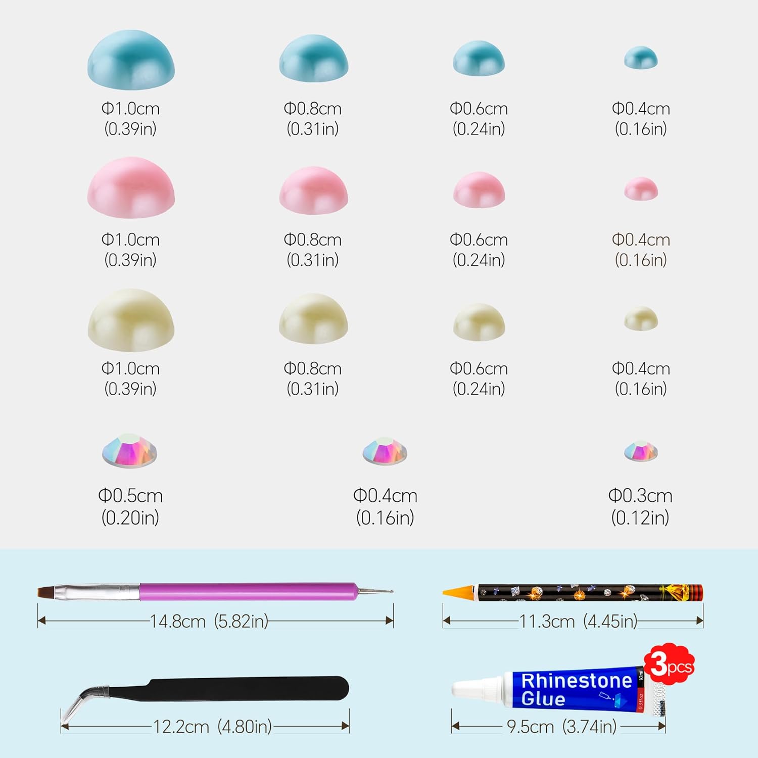- What You Will Receive: 60g(30g*2)mixed size flat back pearls and rhinestones. 3*Rhinestone Glue. 1* wax pencil for rhinestones. 1*Pencil sharpener(color random). The mix half round pearls and rhinestones can make more beautiful handicrafts for your friends, parents, yourselfs on any festivals.If you need a mixed size pack of pearl rhinestones, search on Amazon:B0BBL2KVMD