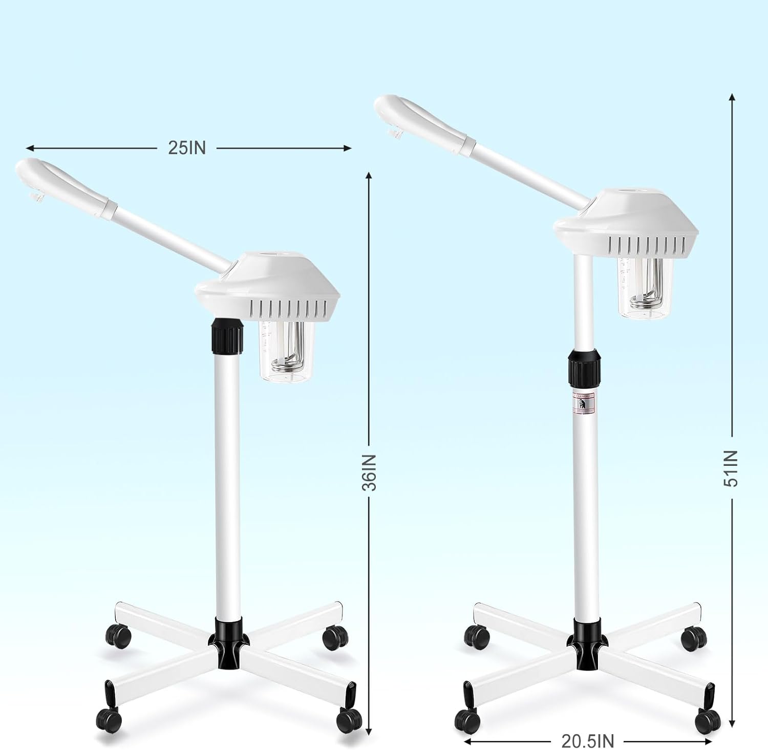 - ⭐【Adjustable Height】–The height of this professional facial steamer can be adjusted from 36 inches to 51 inches, with a 360-degree rotating main frame and a 360-degree rotating nozzle, which is very suitable for spa or home personal care.
