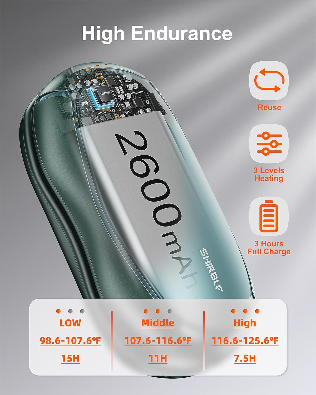 - 【Rechargeable & Three Levels of Temperature】Electric hand warmers, 5200mah rechargable hand warms with up to 12 hours battery life, USB hand warmer. With 3-speed indicator light, you can adjust three different temperatures, the use of time is 7-9.5-12 hours. Choose the right temperature for a comfortable using experience.