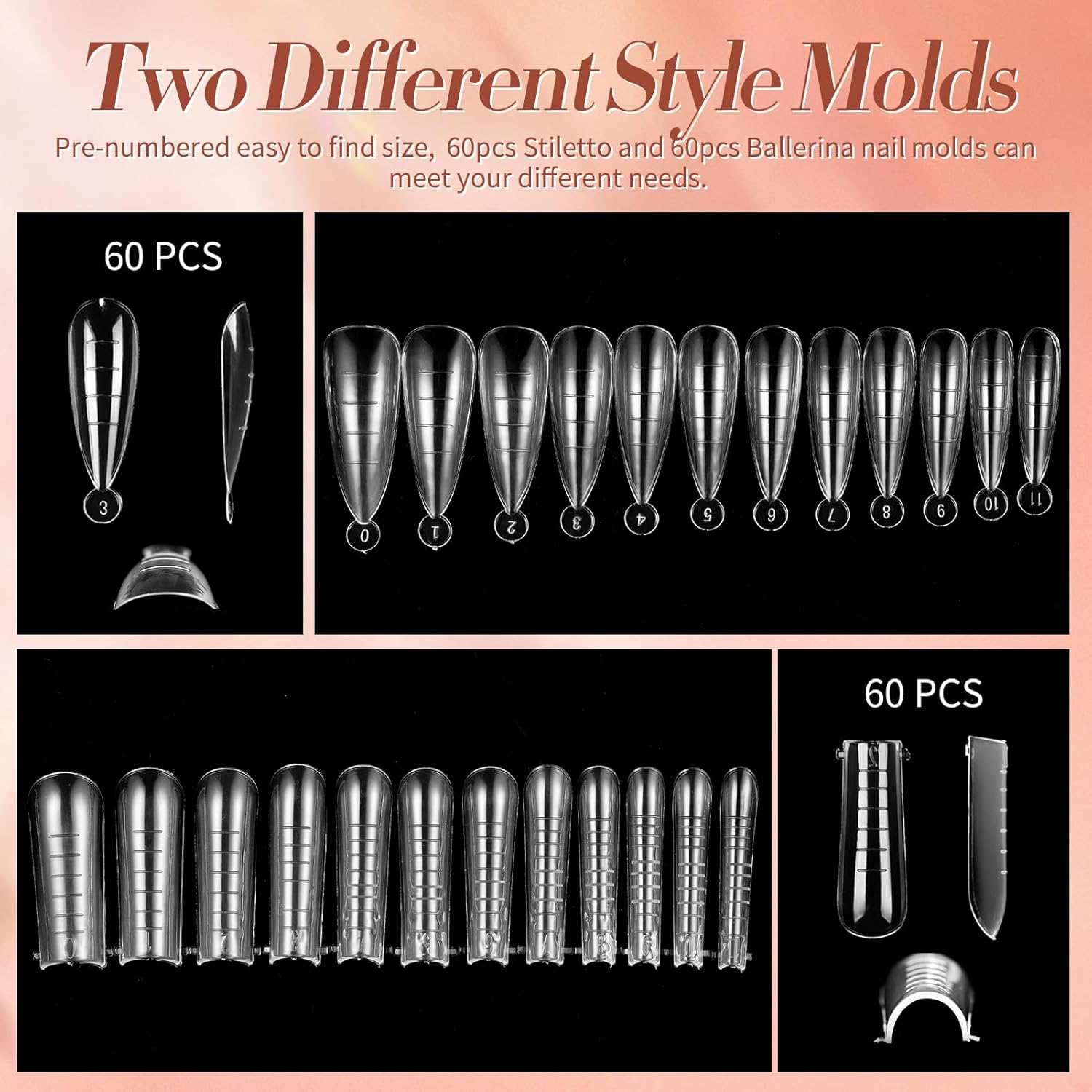 - QUICK BUILDING AND LONG LASTING: Even beginners can create beautiful nail extensions in just 3 minutes with the builder nail gel included in this kit. When applied properly, the extensions can last up to one month. With the right application technique, you can enjoy wearing them for 2+ weeks. The package includes 12pcs of poly extension nail gel in different colors, a mini LED lamp, nail-molds in all sizes, nail forms, a dual forms pen, gel base and matte topcoat, slip solution, and a buffer file.