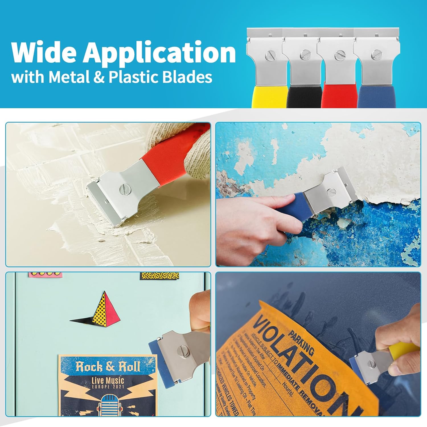 - PREMIUM MATERIAL: Crafted for comfort and control, the scraper features a non-slip rubber handle, ensuring a comfortable grip. The body is made from high-strength steel alloy, while the metal blades are crafted from high-carbon steel and the plastic blades from premium injection-molded material. Sturdy, they are built to withstand use without deformation or breakage.