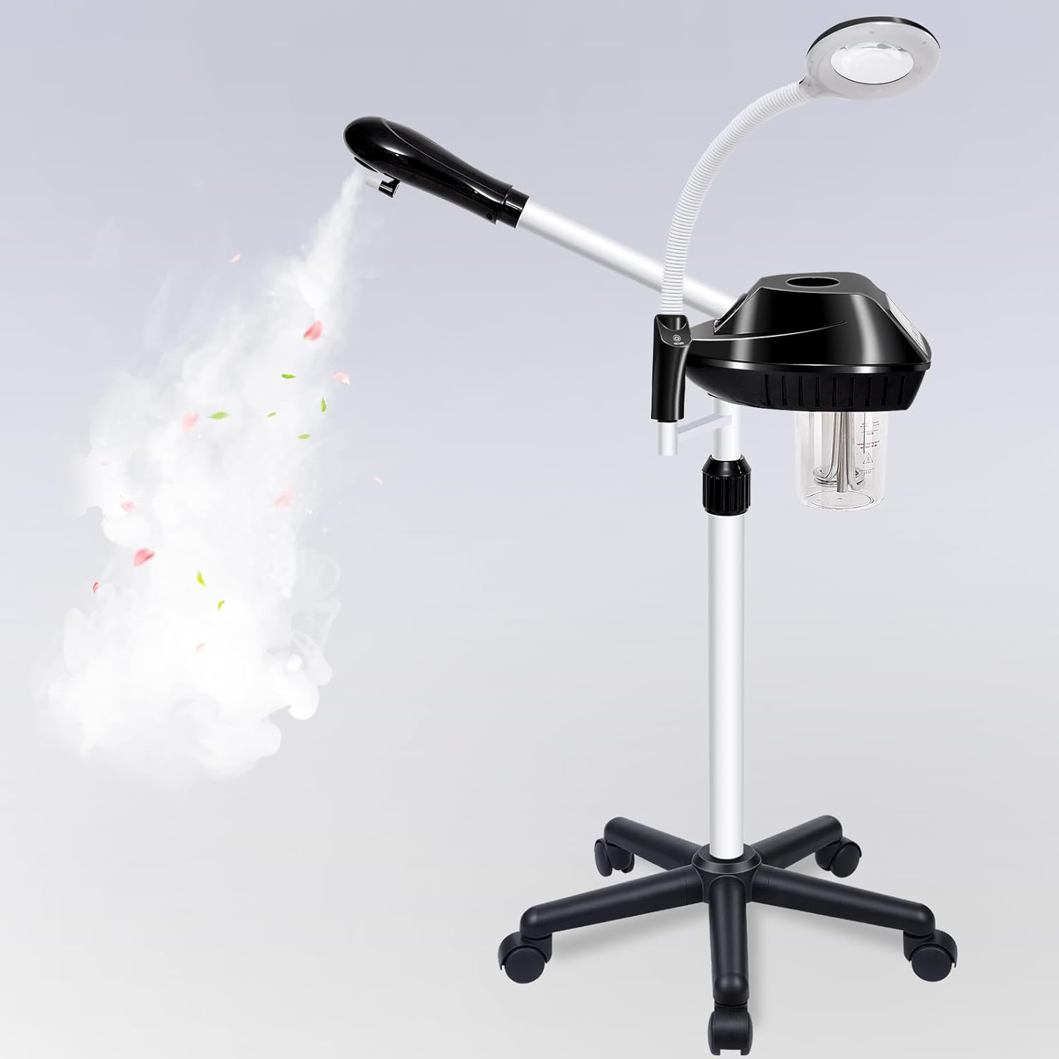 Professional Facial Steamer, 2 in 1 Face Steamer on Wheels, with 5X Magnifying Lamp, Facial Steamer with Time Setting, Stand Face Steamer Adjustable Height for Spa, Salon and at Home use