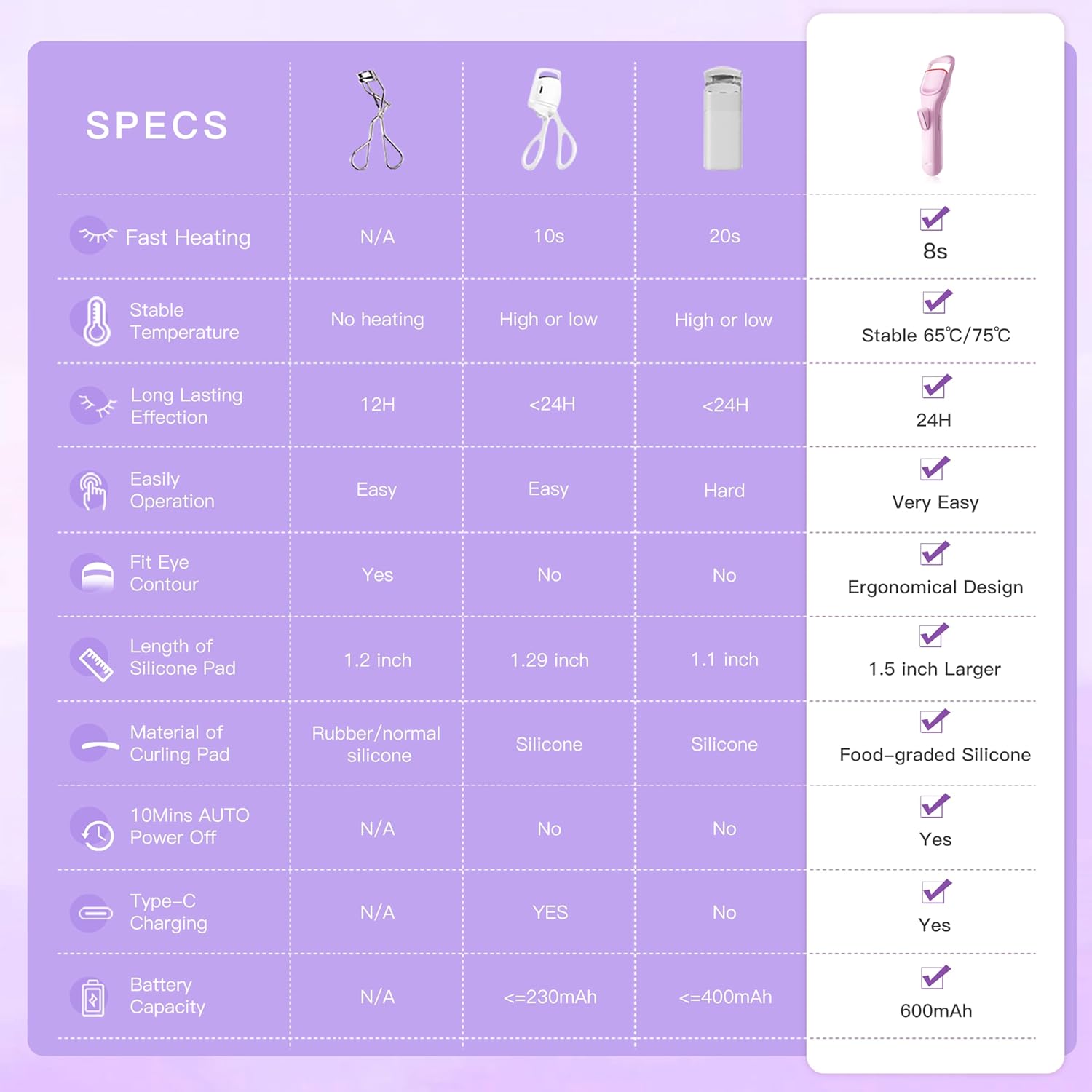 - ADVANCED SMART TEMPUTURE CONTROL SYSTEM: Heating Eyelashes Curler make the accuracy of temperature is improved 60%, achieved the curling temputure fluctuating only at +/-3 ° after fully warm up, not +/-10 ° like others heating eye lash curlers. more stabilized curling temputure offer quantity of heat to get better curling result and long lasting.