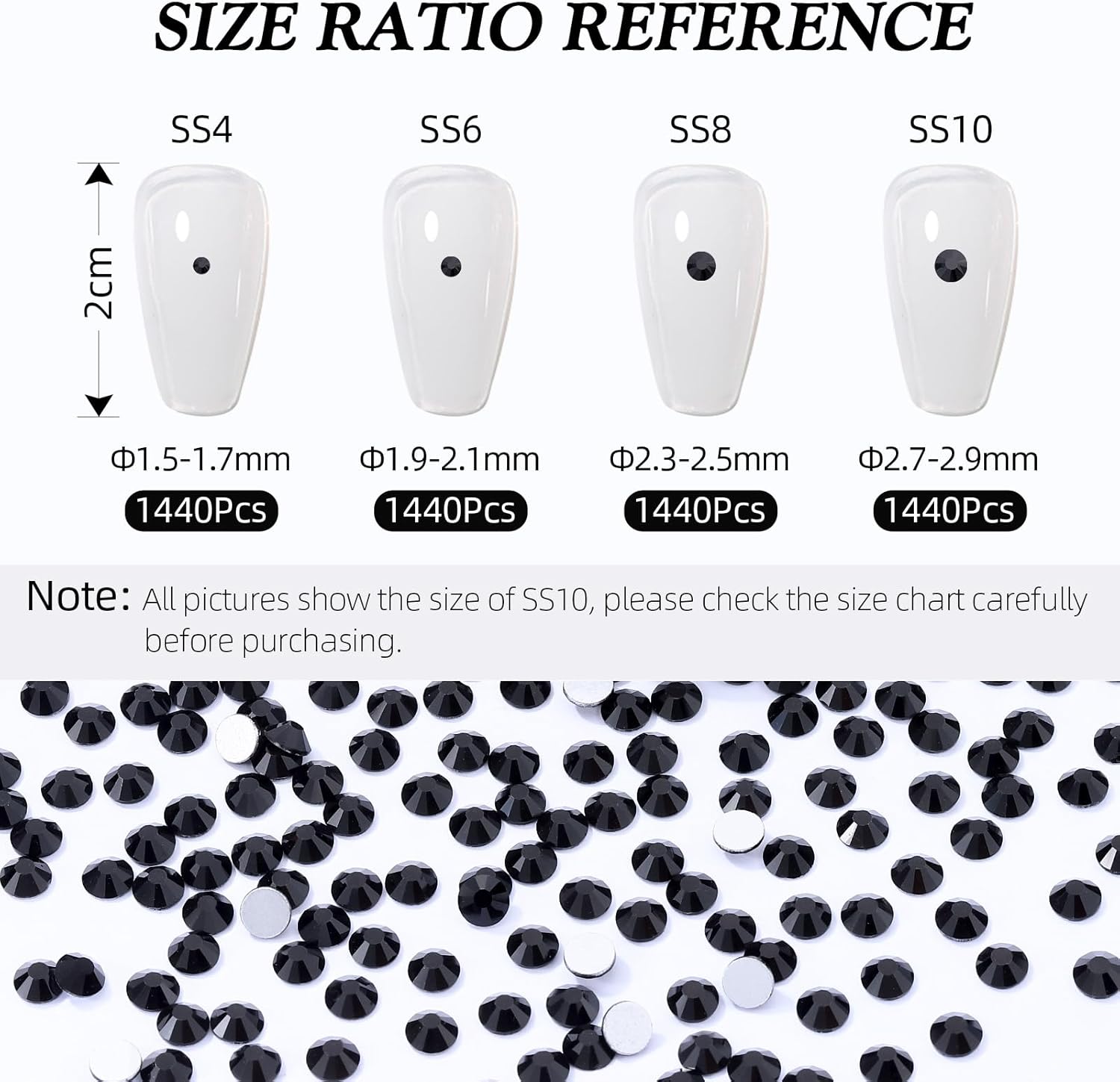 Black Flatback Rhinestones, Glass Rhinestones for Nail Art and Craft, Glue Fix, Loose Crystal Gemstones(Black, SS10, 1440pcs, 2.7-2.8mm)