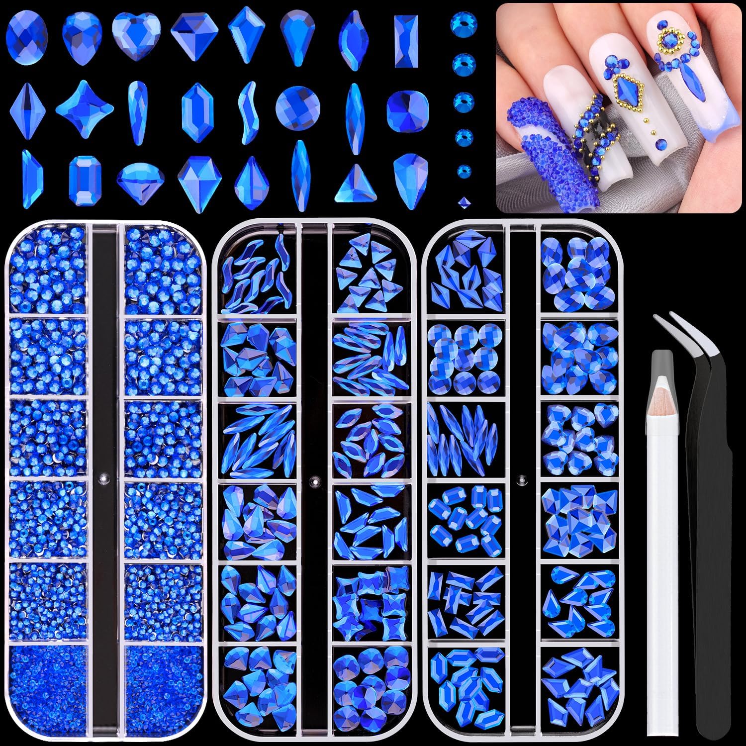 • 💎PACKAGE CONTENT -- The package contains 240Pcs multi shapes flatback gems crystal and 2510Pcs 1.5-4mm round beads, totally 2750Pcs Royal Blue rhinestones. Additionally, 1 tweezers for large size gems and 1 pickup pen for small size gems. This rhinestones kit makes it easy for you to make any nail art you like, and will bedazzle your acrylic nails!