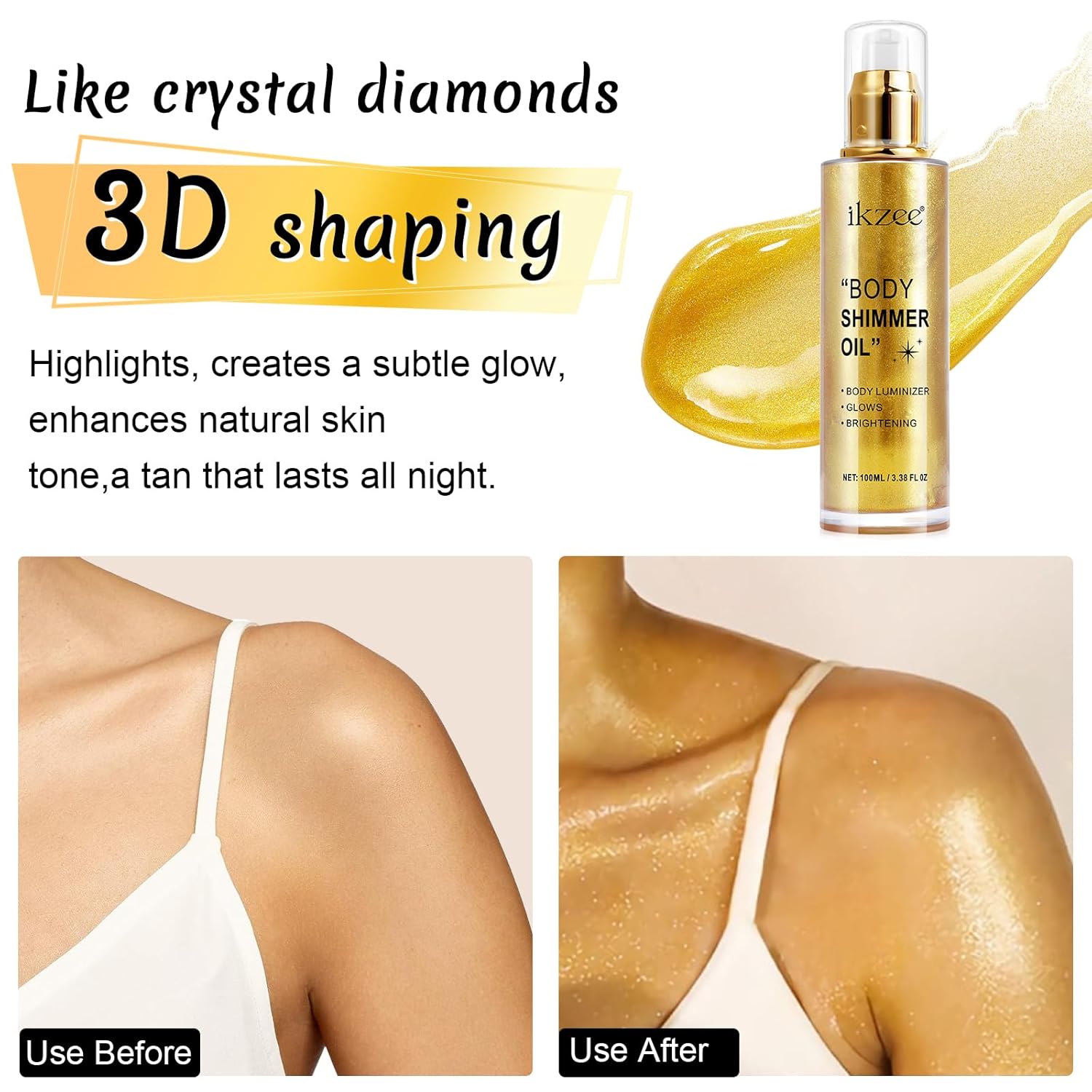 - ⦠SHIMMERING BODY GLOWING LUMINIZER -- This shimmer body oil brightens your complexion, the flecks of shimmer catch the light and make your skin glow, giving your skin an attractive shimmer in the sun, giving you a more natural and healthier complexion.