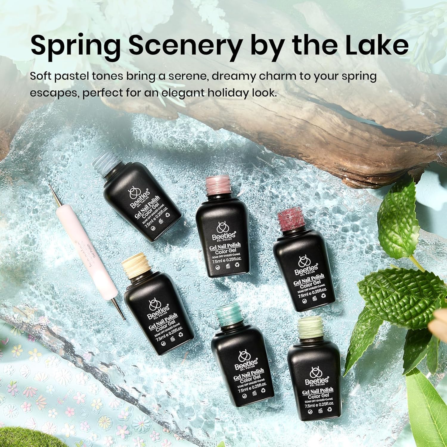 - Unique Design Gel Polish: Beetles 2025 pastel gel nail polish set includes 7.5ml spring summer gel polish*6, flower stickers*1, double-ended dotting pen*1. Get the perfect manicure at home for the best salon manicure for a fraction of the cost! Color Number: a474-f433-f376-f375-d192 C043