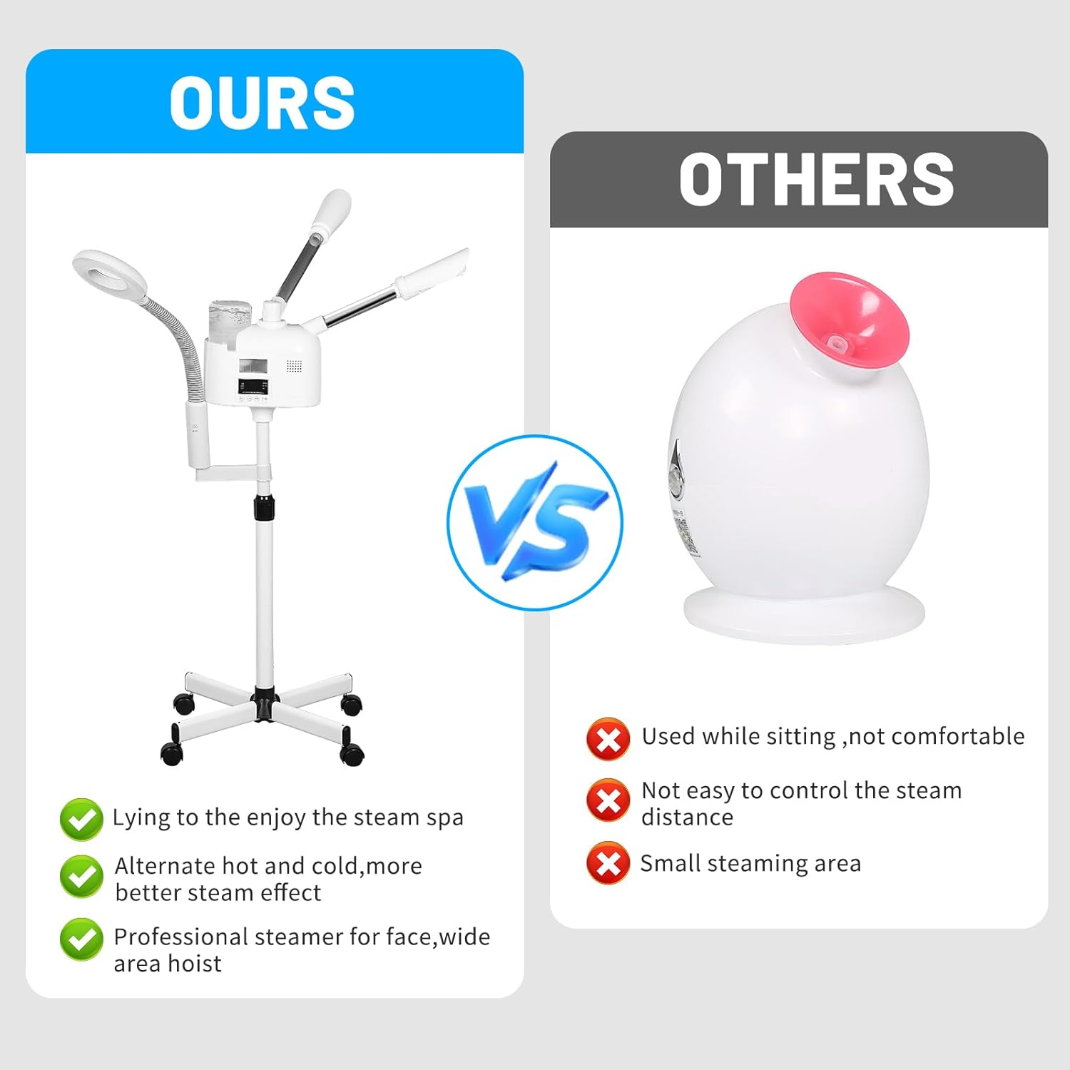 - GREAT QUALITY - Steamer for face spa on wheels,high quality warm stainless steel pipe, sturdy and durable, high capacity water cup, can store 1000ml water, the steamer generates the mist quickly with 1-3mins,the head of the machine is free to rotate 360°. Adjustable height from 38.1" - 48"