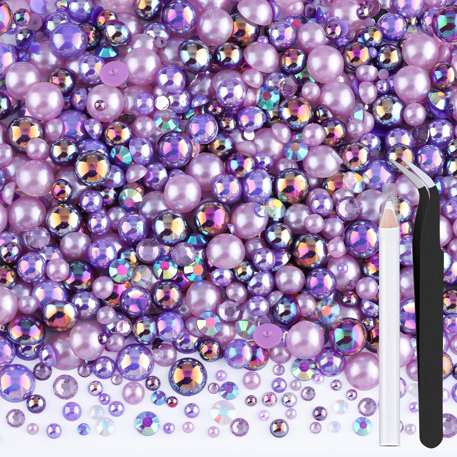 80g Flatback Pearls and Rhinestones for Crafting, Purple Mixed Size 3-10mm Resin Rhinestones and Half Pearls for Bedazzling, Nail Art and Decoration with Tweezer and Pickup Pencil