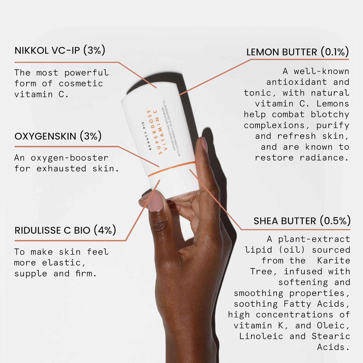- Exceptional Ingredients: NIKKOL VC-IP (3%) - The most powerful form of cosmetic vitamin C. OXYGENSKIN (3%) - An oxygen-booster for exhausted skin. RIDULISSE C BIO (4%) - To make skin feel more elastic, supple and firm. Helps prevent hyperpigmentation, calms skin. LEMON BUTTER (0.1%) - A well-known antioxidant and tonic, with natural vitamin C. SHEA BUTTER (0.5%) - Infused with softening and smoothing properties.