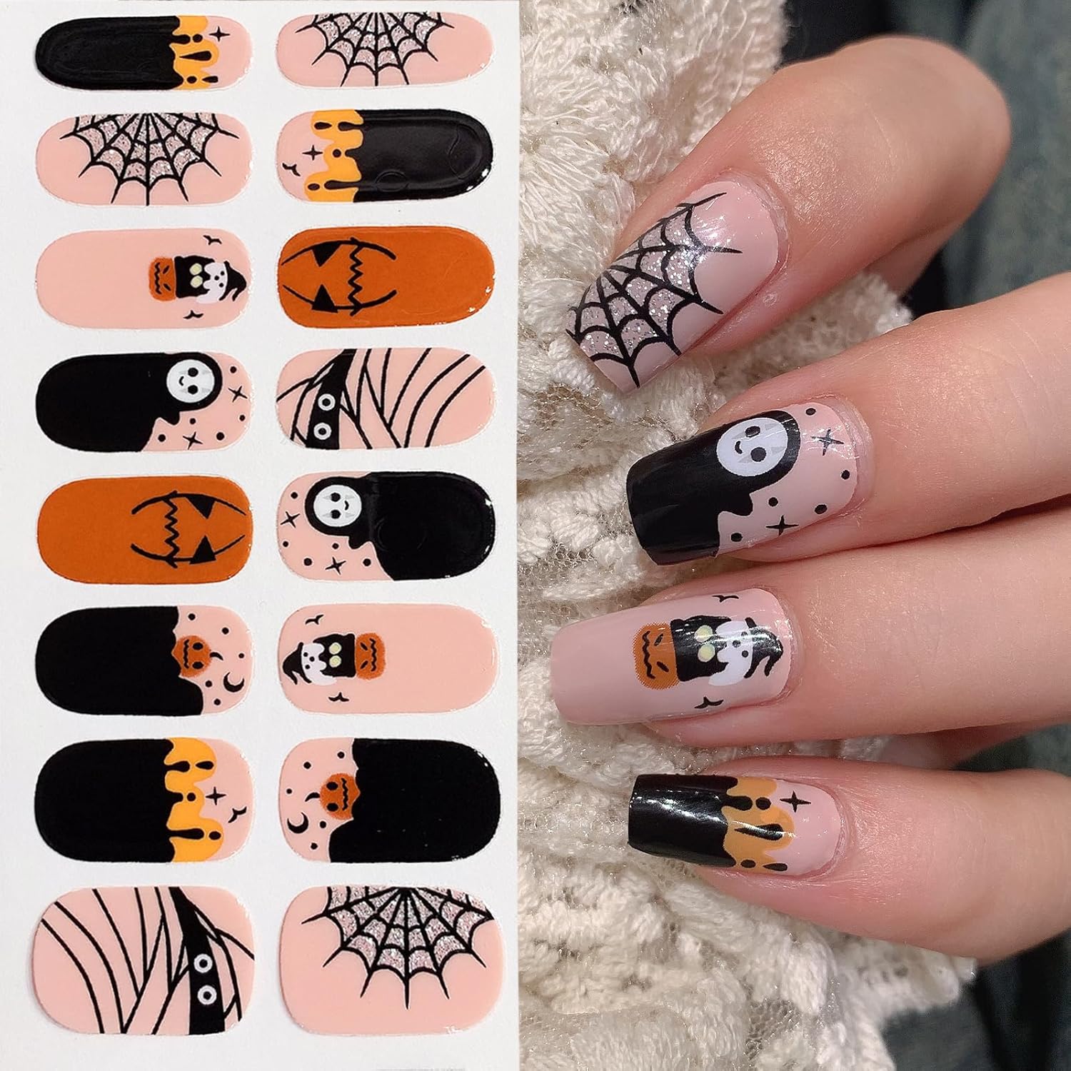 8 Sheets Halloween Nail Wraps Full Stickers Nail Polish Strips, DIY Self-Adhesive Nail Art Decals Pumpkin Bat Ghost Spider Web Skull Pattern with 1 Piece Nail Files for Party Decor (128 Pieces)