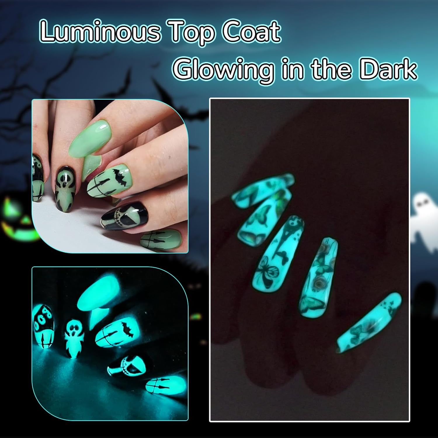 - Luminous Nail Gel: This Glow Top Gel need to cure over 2 mins for getting a better glow effect! After applying the color nail polish, apply a layer of luminous sealing layer to immediately make your nails have a different fluorescent shimmery effect. This bottle illuminates green. Glows perfect