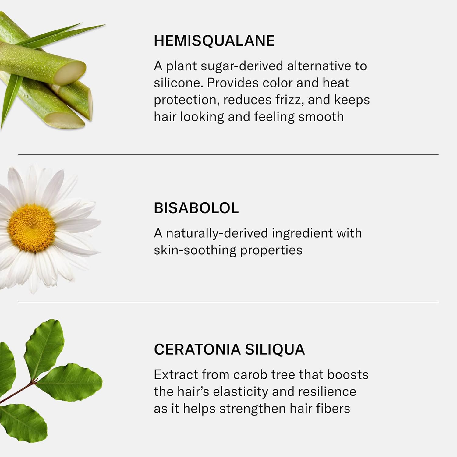 - Hero Ingredients: Hemisqualane – a plant sugar-derived silicone alternative that reduces frizz, provides color and heat protection, and keeps hair smooth. Bisabolol – a naturally-derived ingredient that soothes skin. Ceratonia Siliqua – carob tree extract that boosts elasticity and strengthens hair fibers. Moringa Oleifera – horseradish tree extract that helps protect hair from pollution and UV damage. Squalane – a plant sugar-derived moisturizer that nourishes, restores luster, and adds shine and softness.
