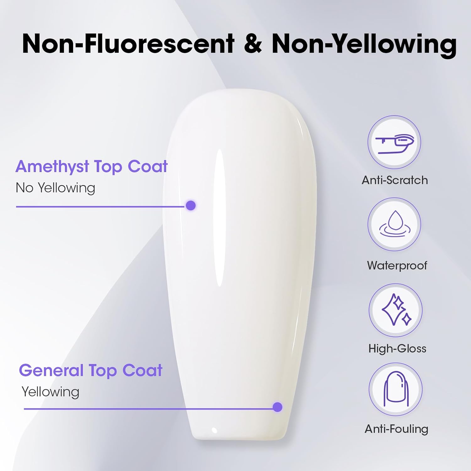 - Crystal Clear & Highly Translucent: Gellenβs Amethyst Top Coat Gel has a mauve tint but is highly translucent and non-fluorescent, allowing the underlying color of your gel polish to shine through. Its clear, glass-like appearance enhances the vibrancy of your nails without altering their original color.