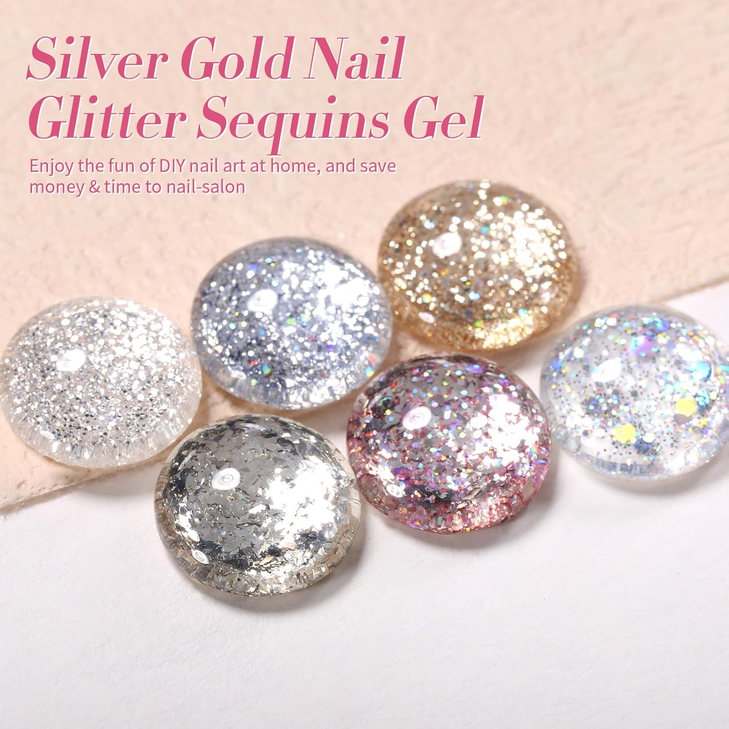 Born Pretty Glitter Gel Nail Polish Super Sparkly Shine Glitter Sequins Gel Polish Gold Silver Champagne Gold Gel Polish Kit DIY at Home Valentine's Day Gift Collection 6PCS