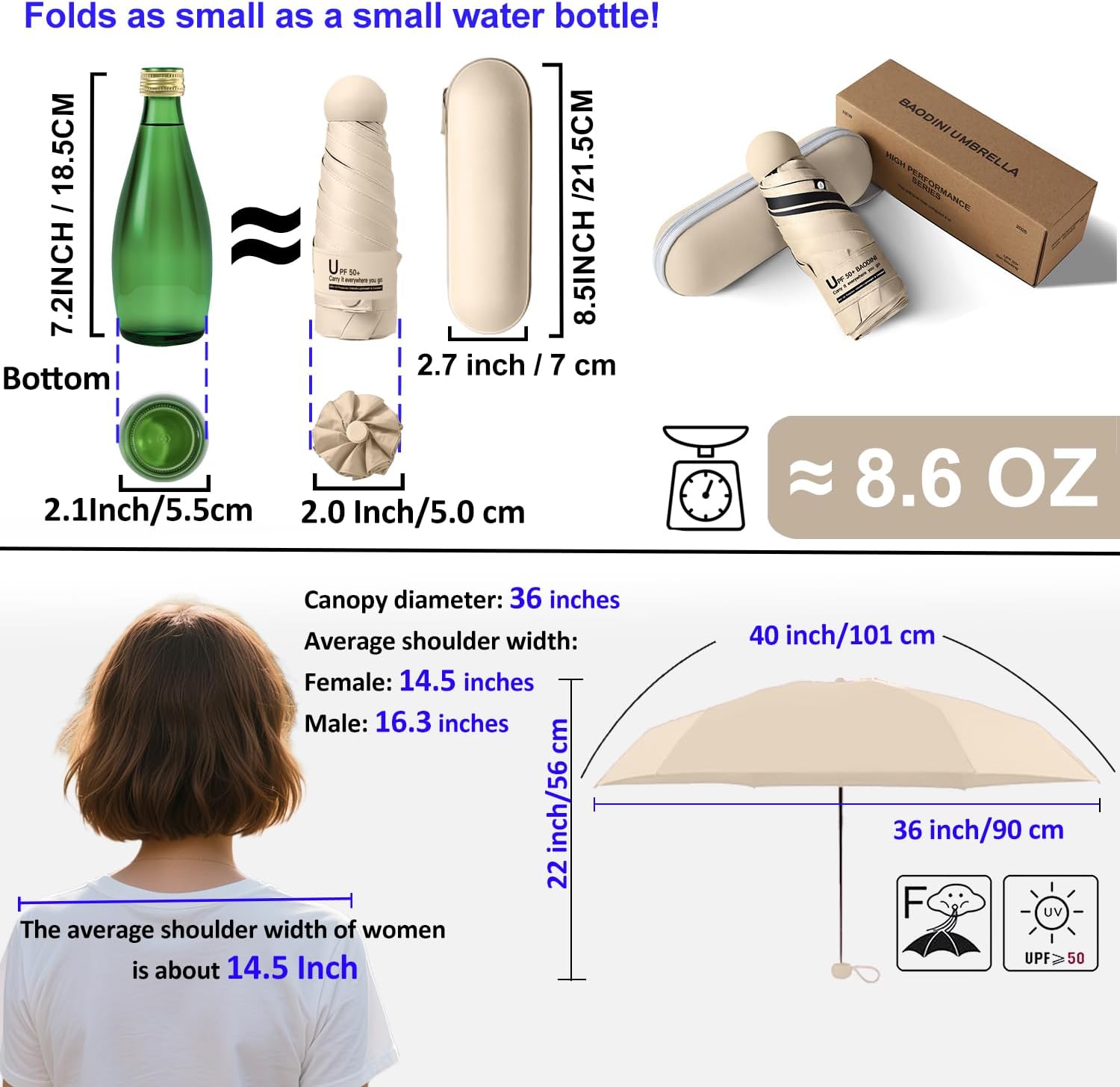 BAODINI Travel Essentials Mini Umbrella for Purse With Case Small Compact UV Sun Protection Lightweight Tiny Pocket Manual Open Close Umbrella for Women Kids and Men Fit Purse Backpack