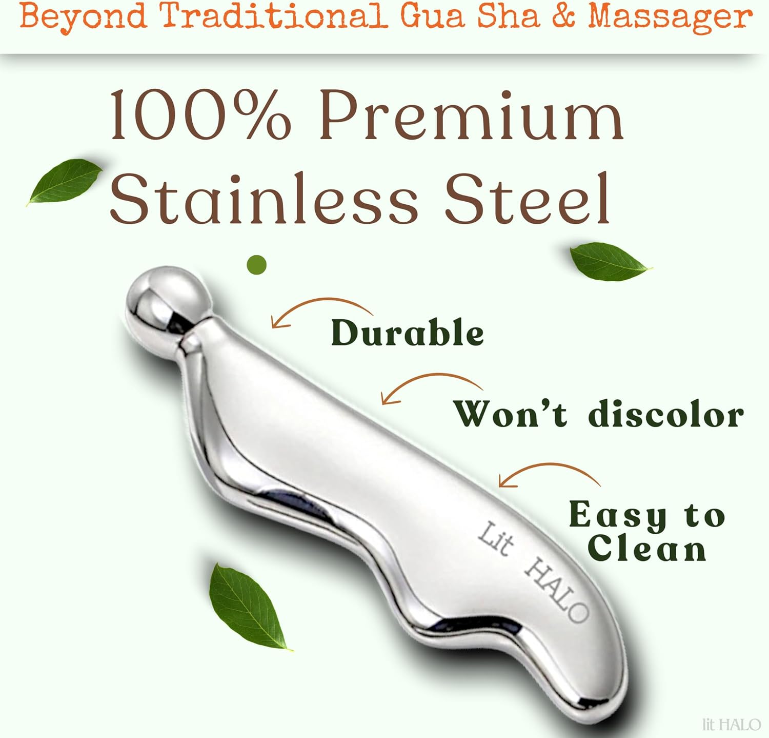 - HYGIENIC AND DURABLE: Lit HALO Gua Sha is crafted from 304 stainless steel, designed to enhance lymphatic drainage and improve circulation. Unlike jade or quartz, stainless steel is more durable, hygienic, and long-lasting, making it a perfect choice for everyday use.