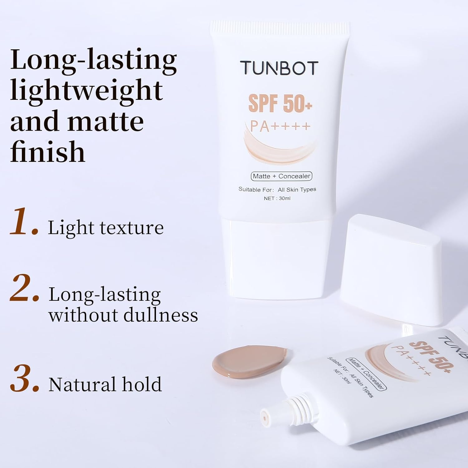 TUNBOT Liquid Makeup Foundation with SPF 50, Makeup to Cover Facial Imperfections, Unscented Foundation for All Skin Types (30ml)