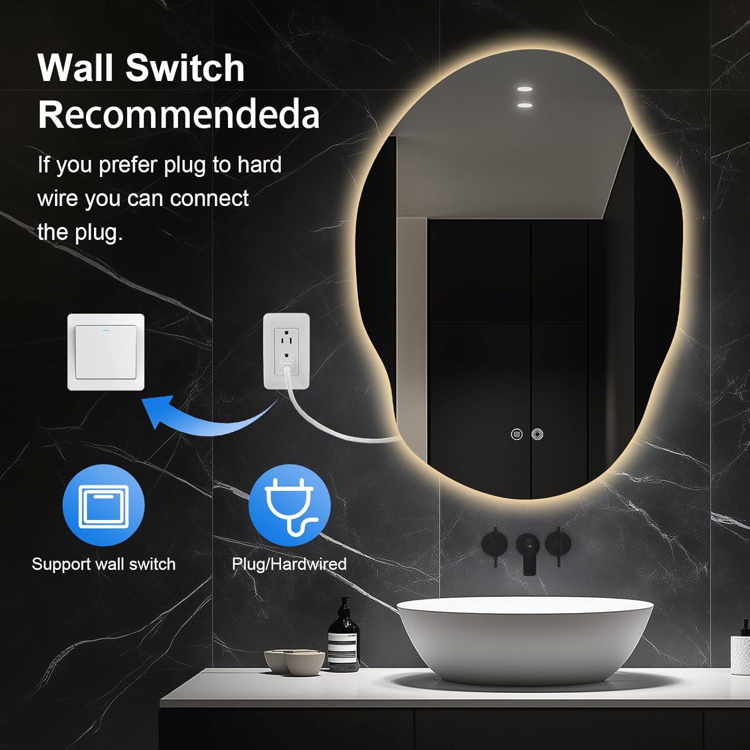 Asymmetrical LED Bathroom Mirror with Lights,Irregular Led Bathroom Vanity Mirror for Wall with Front and Backlit, Anti Fog, 3 Colors and Dimmable Light,[Horizontal/Vertical] 40" H x 30" W