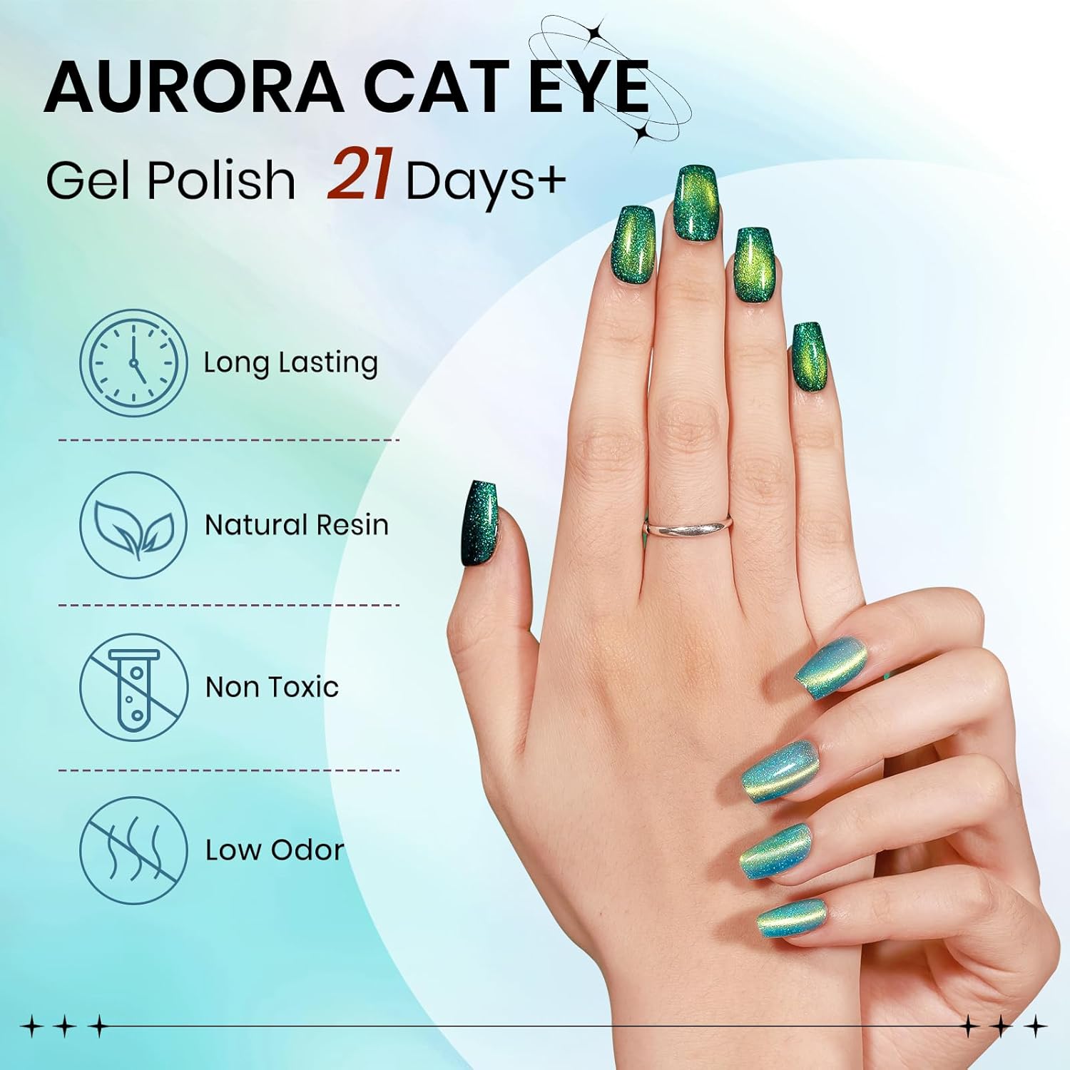 - Aurora Cat Eye Gel Polish: 1*15ml(0.5fl oz) aurora green cat eye gel nail polish with 1pc magnetic stick. Suitable for all occasions to wear, both daily and special occasions can show a unique style