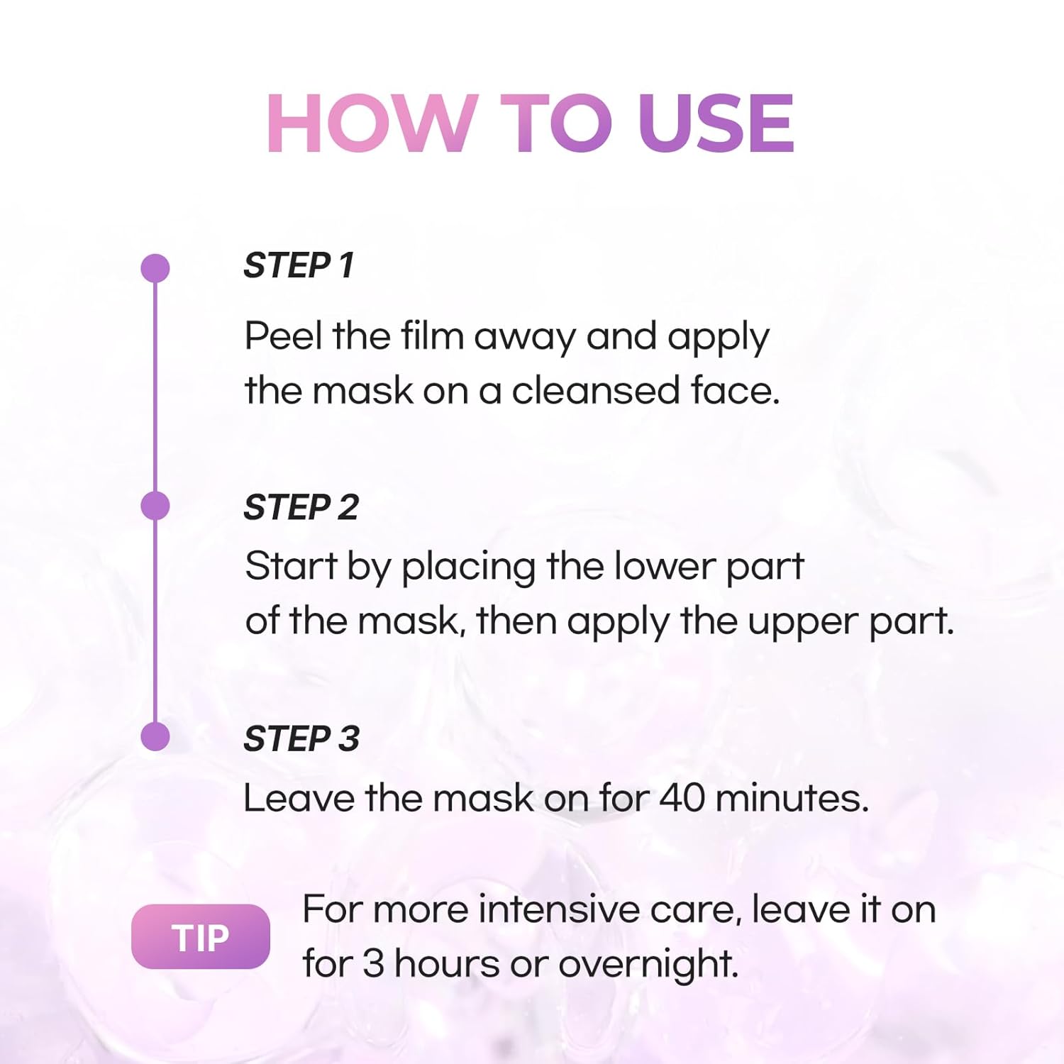 - [COLOR-CHANGING HYDROGEL] The gel mask becomes transparent after 3 hours, indicating that the active ingredients have been effectively absorbed into the skin.