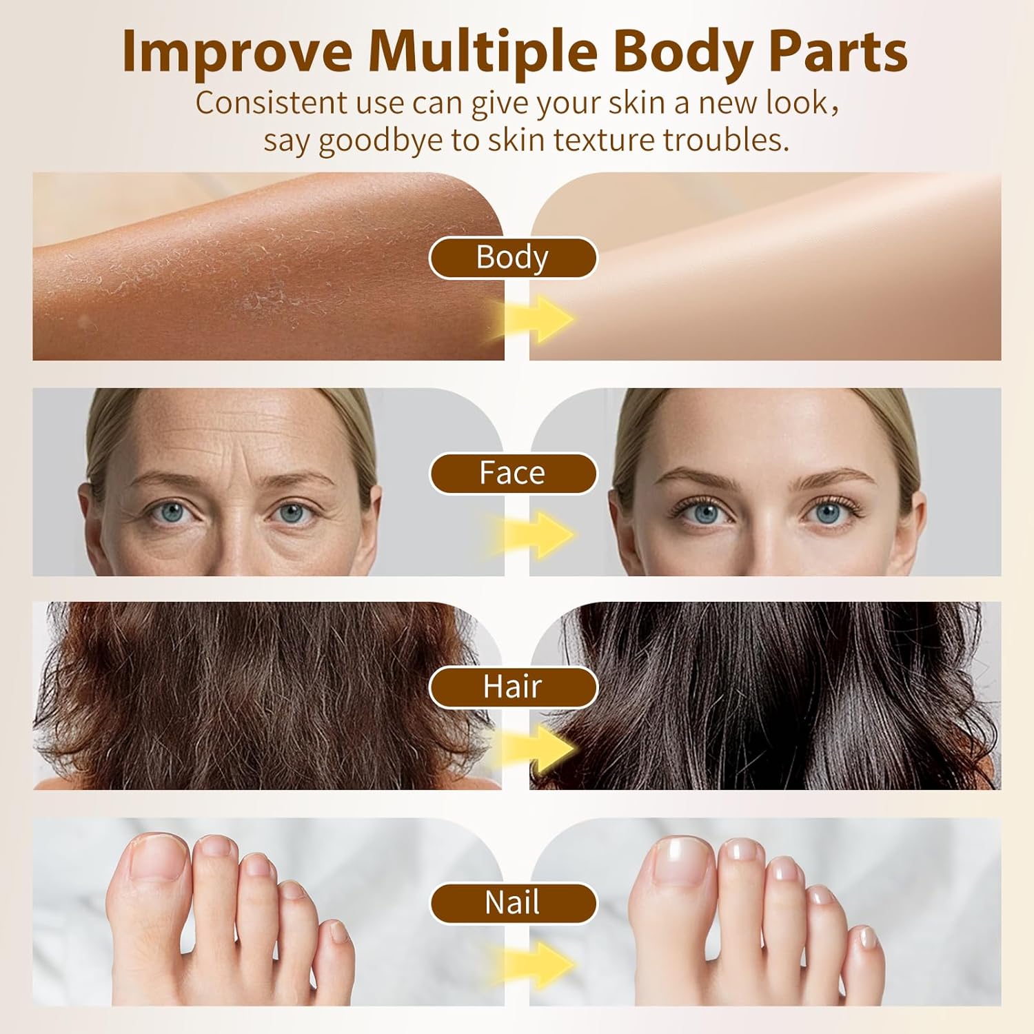 - Hair & Nail Care Partners: Vitamin e oil for hair and nails, strengthens nails to minimize breakage and layering troubles, and repairs damaged hair, saying goodbye to split ends and dryness. Whether it's fragile nails due to manicure, or permed and damaged hair, it can infuse them with nutrients and revitalize their health.