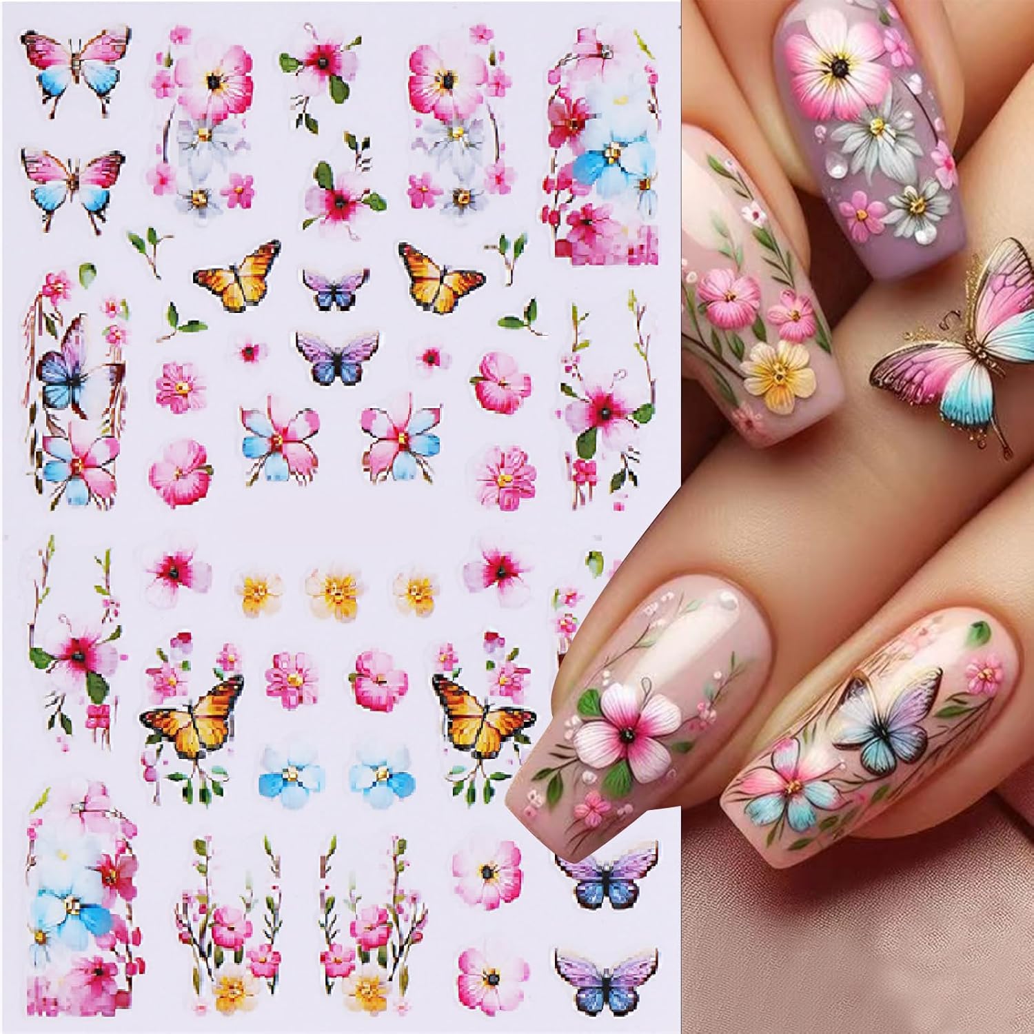 8 Sheets Spring Butterfly Nail Stickers Peach Blossom Nail Art Stickers 3D Self-Adhesive Nail Decals Colorful French Butterfly Petals Leaves Nail Design for Women Girls Spring Summer Nail Decoration