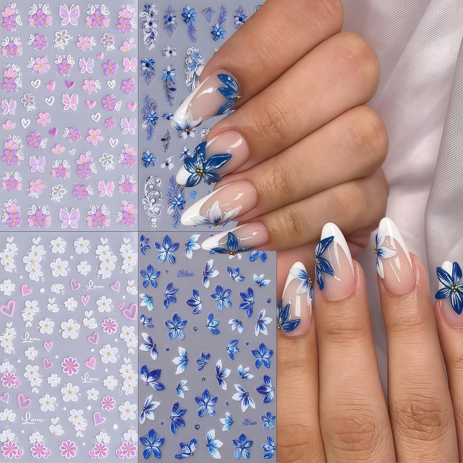 4 Sheets Blue Flower Nail Art Stickers Colored Flower Love Butterfly Nail Stickers 5D Embossed Floral Nail Decals Lily of The Valley Petal Vine Nail Art Supplies for Women Girl DIY Nail Decorations