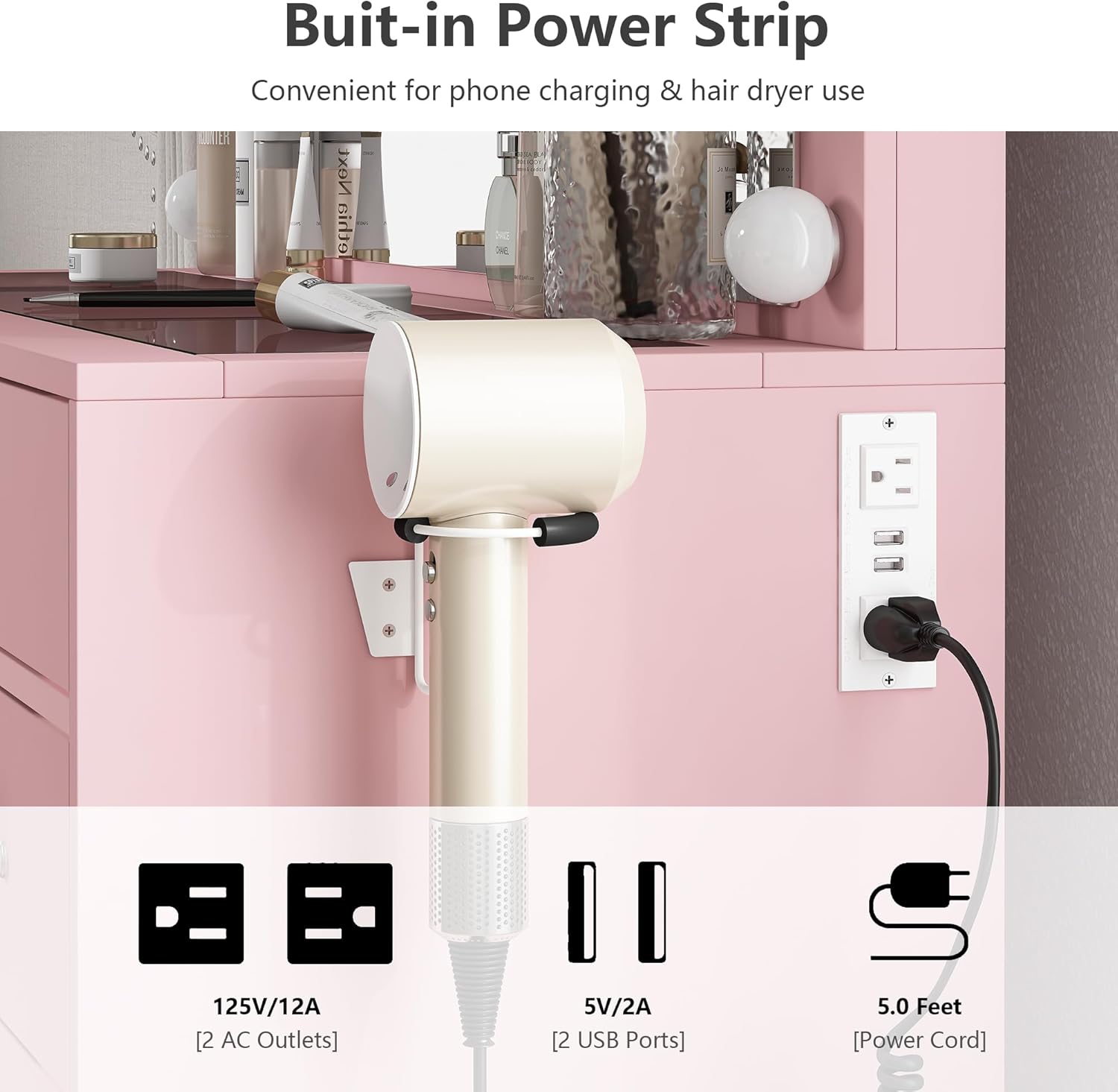 - Come with Power Outlet: This vanity table comes with a charging station and hair dryer holder, including 2 standard plug sockets and 2 USB ports. While using the dressing table, you can also connect your hair dryer, curling iron, phone, computer, and tablet