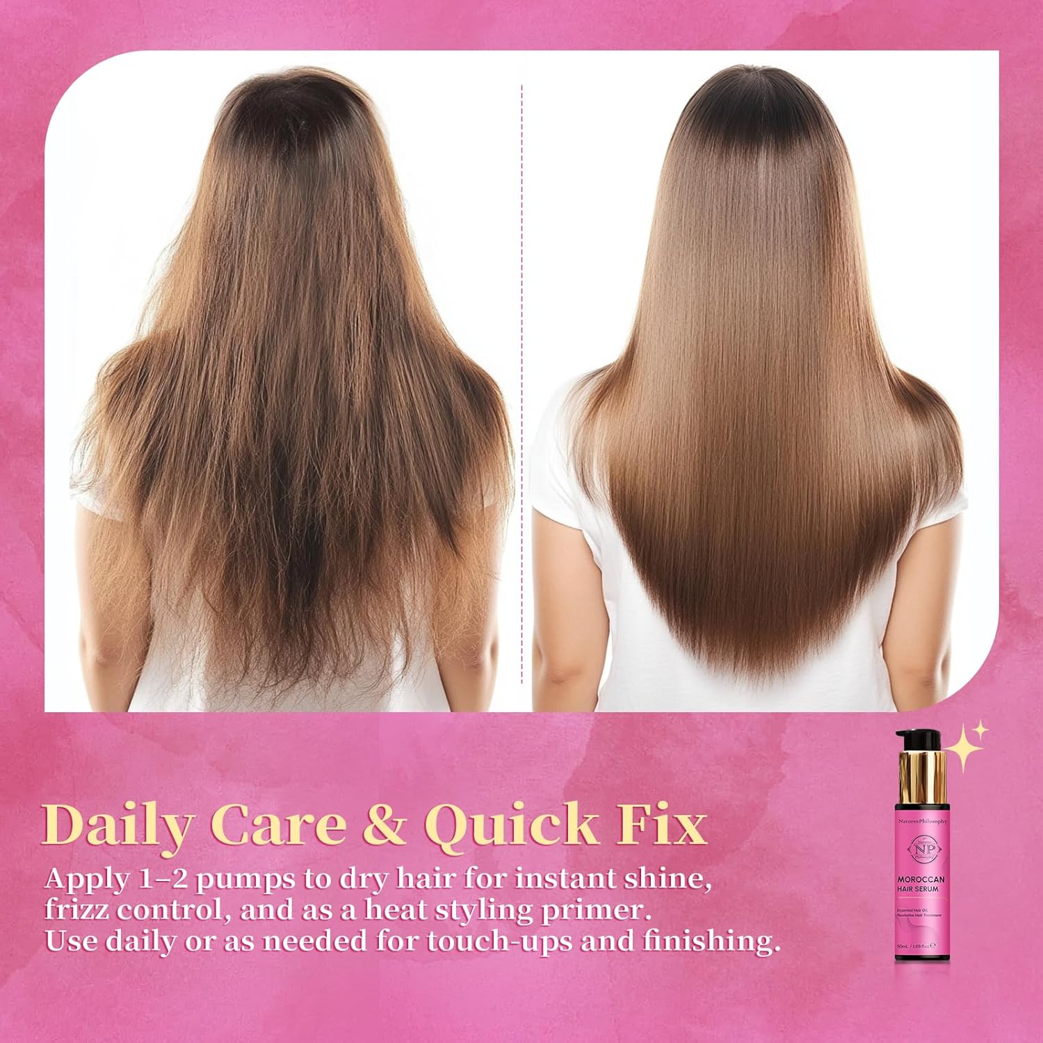 - Anti - Frizz Protection:Instantly smooths and tames flyaways! Our Moroccan oil forms a protective barrier around each hair strand, reducing frizz caused by humidity and environmental factors. It keeps your hair sleek and under control all day long