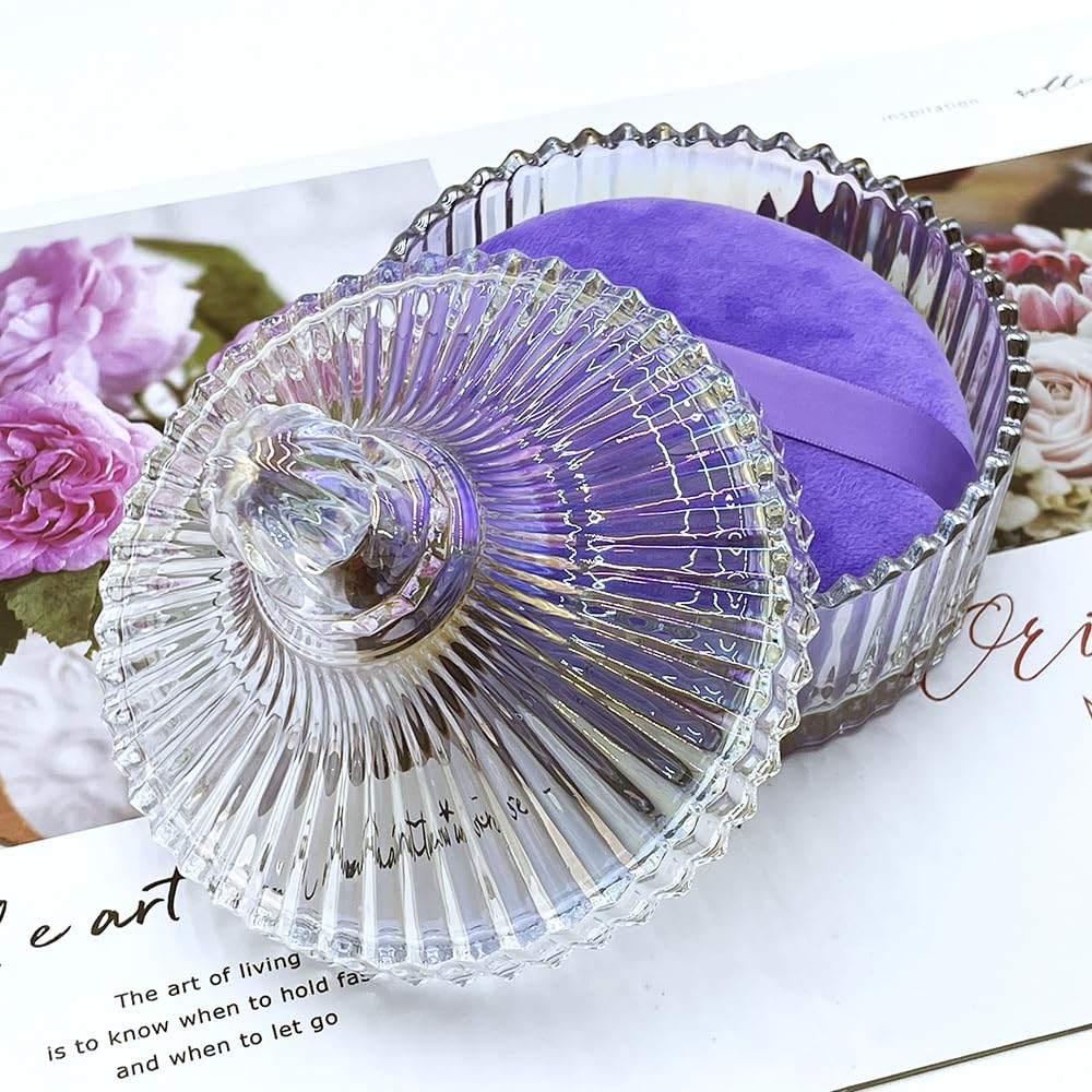 2 Pack Extra Large 5.2" Beige & Purple Powder Puffs and 5.3" Glass Container – Oversized Soft Body & Face Large Powder Puff Dusting Powder Jar Holder Case(Dazzling colors Glass)