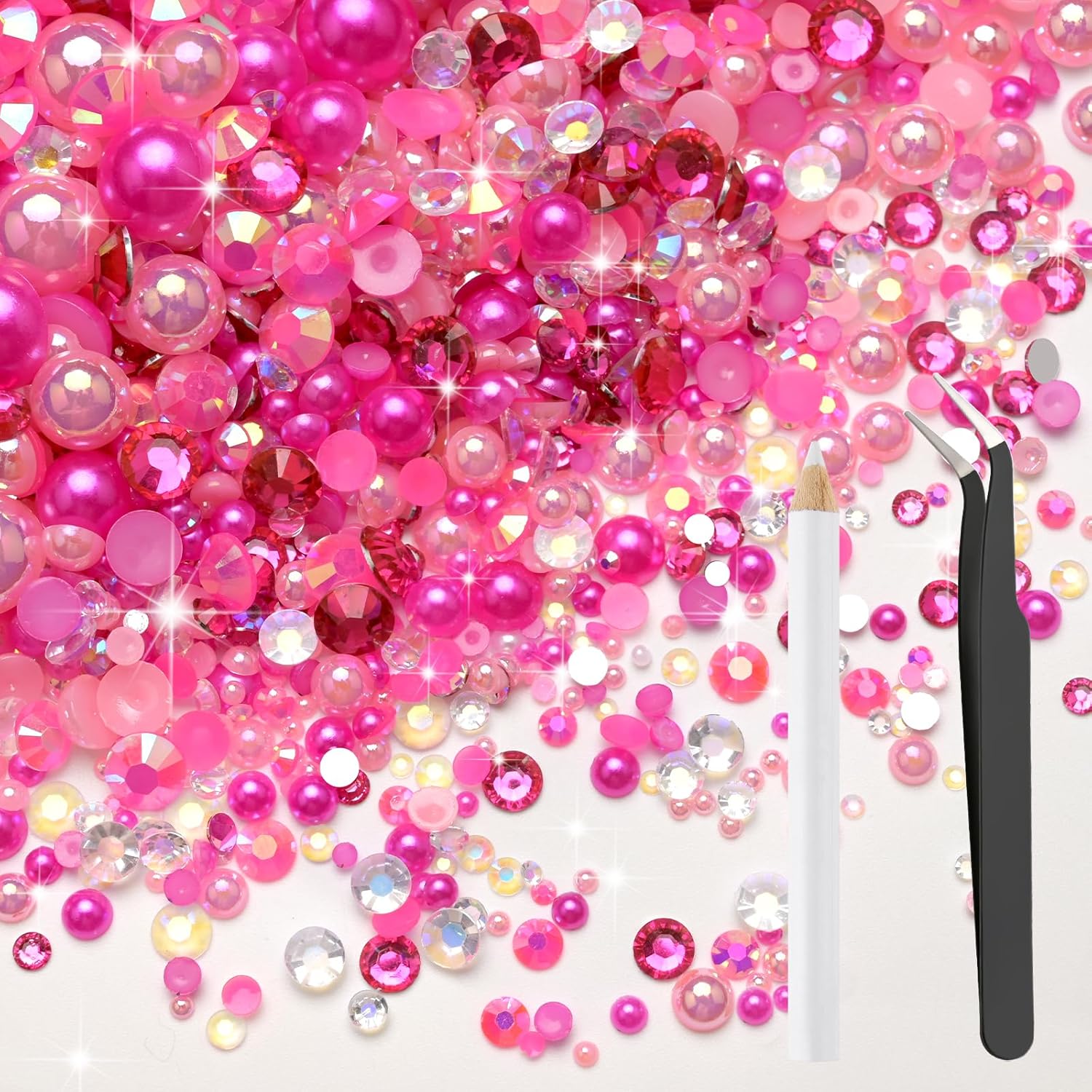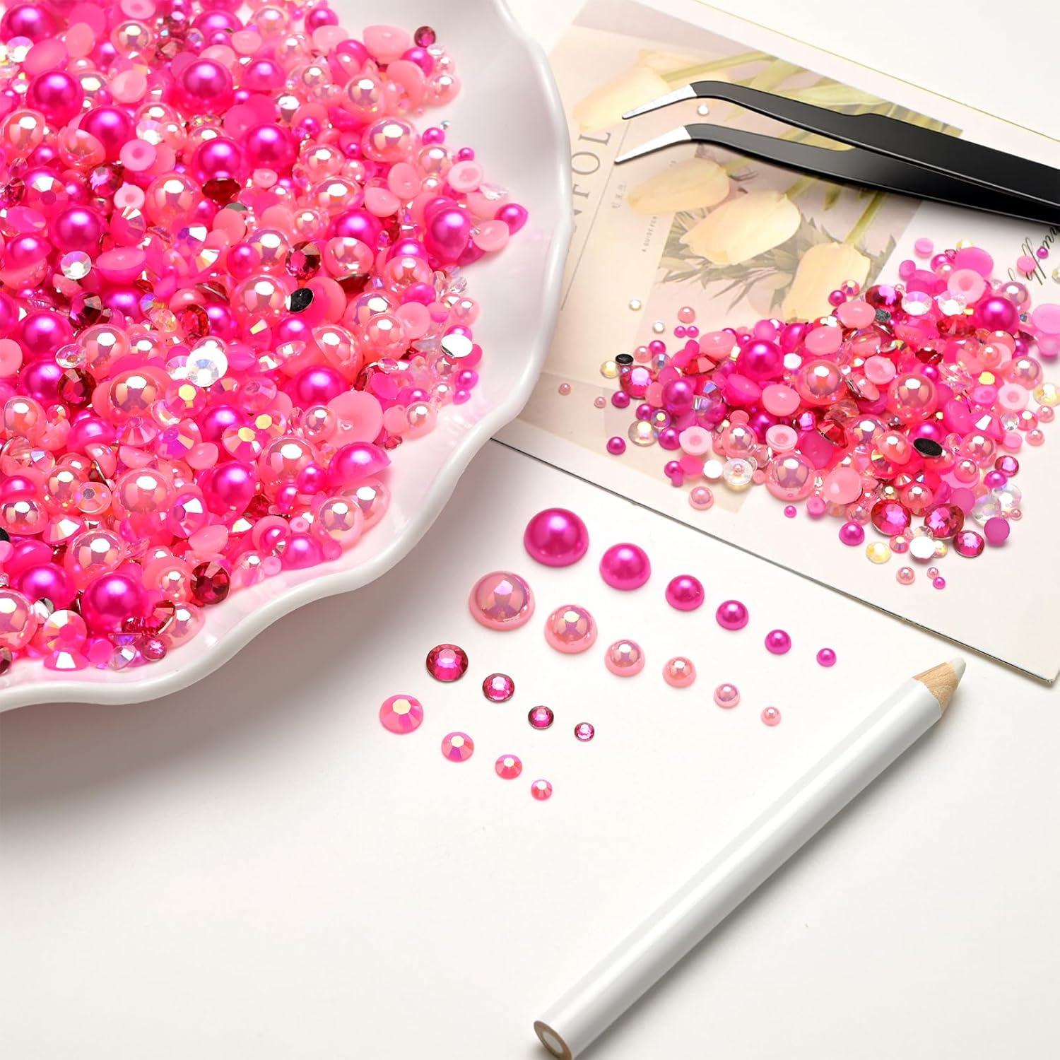 80g Mix Flatback Pearls and Rhinestones for Crafts Pink Mixed Size 2mm-10mm Half Round Pearls Rhinestones for Nail Art Tumblers Shoes DIY Bedazzling with Tweezers Wax Pen
