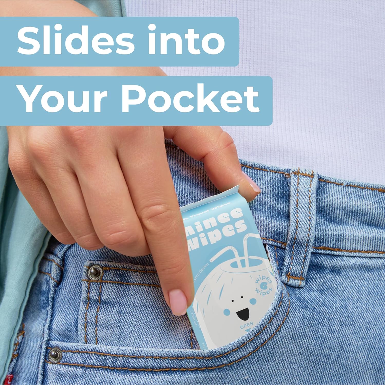 - 💙COMPACT CREDIT CARD SIZE: Minee hand wipes are designed to be as compact as a credit card, making them perfect personal wipes for any occasion. Having 6 wipes in each small bag, these hand and face wipes are ideal wipes for adults and kids, offering a convenient hygiene solution that fits effortlessly into your wallet or purse.